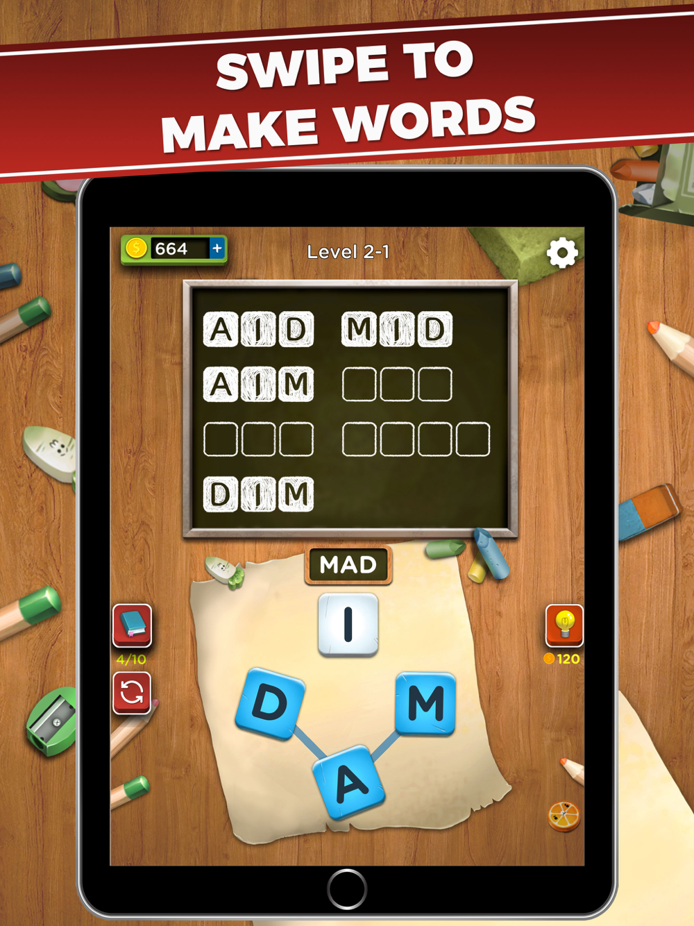 - Find as many words as possible to unlock levels and earn extra bonus coins.