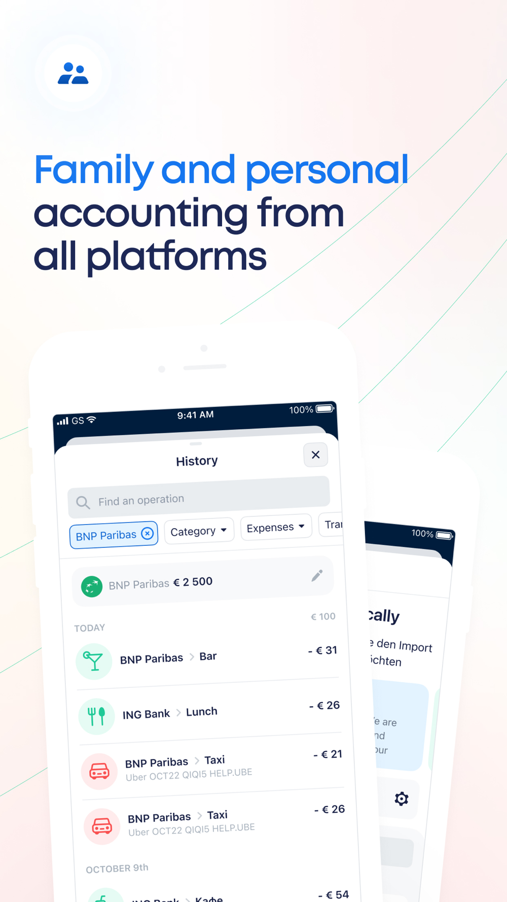 Shared budgeting has never been easier: your family members record expenses in their own devices. Accounts’ balances will be displayed on each device.