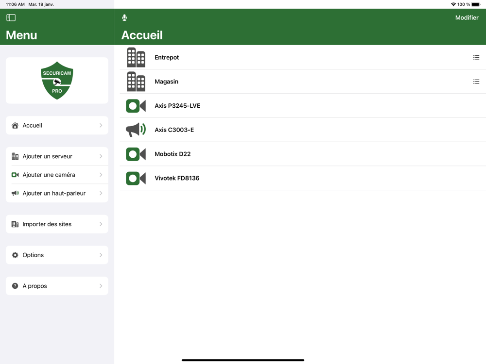 Visualiser depuis votre iPhone ou votre iPad les caméras de votre serveur d'enregistrement SECURICAM-PRO. Il est également possible de configurer et utiliser des caméras de nombreuses marques différentes: Axis, DLink, IQeye, Mobotix, Sony, Vivotek