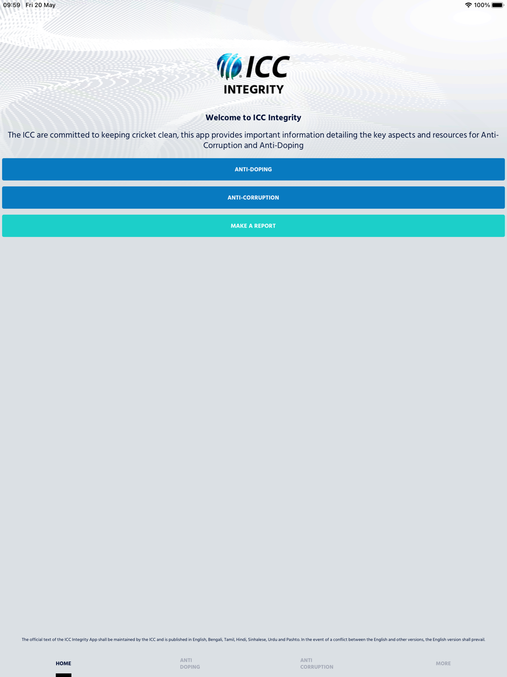 The ICC Integrity App has been developed as a support tool for all cricket Participants (including, without limitation, players, team staff, match-officials, player agents, curators and ICC staff and officials) to protect the spirit and integrity of the game.