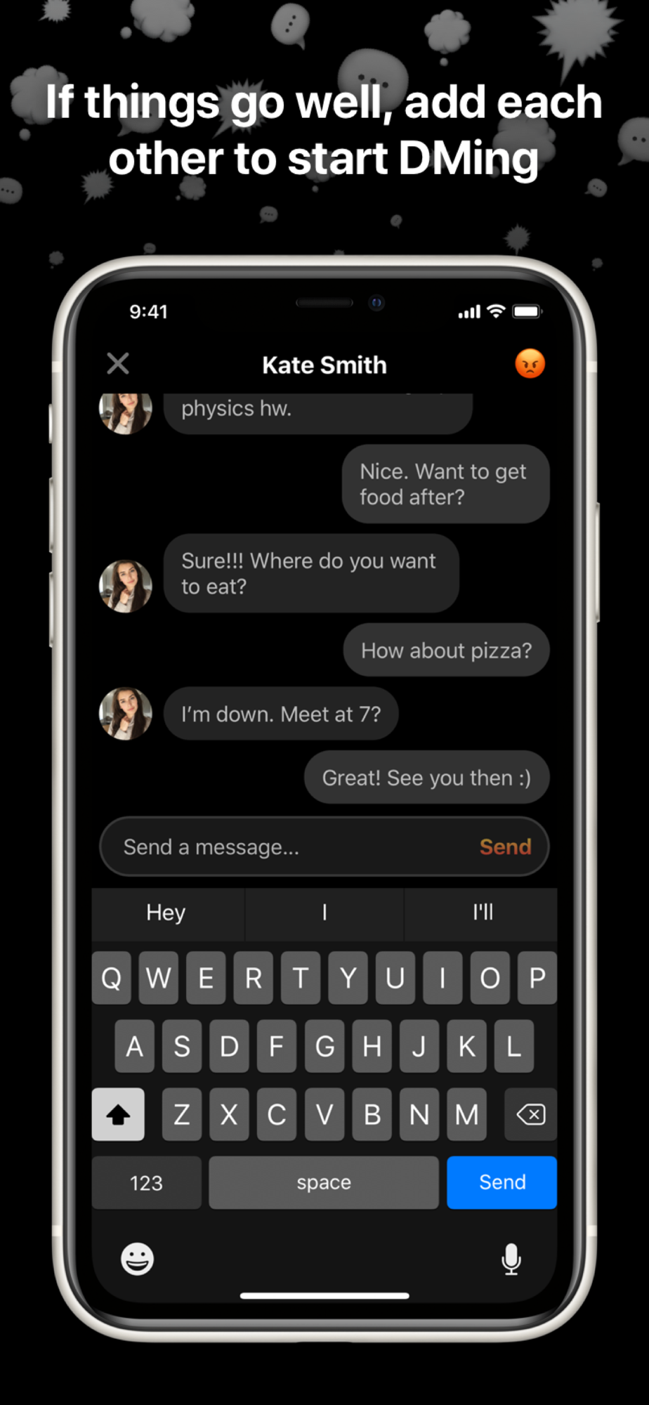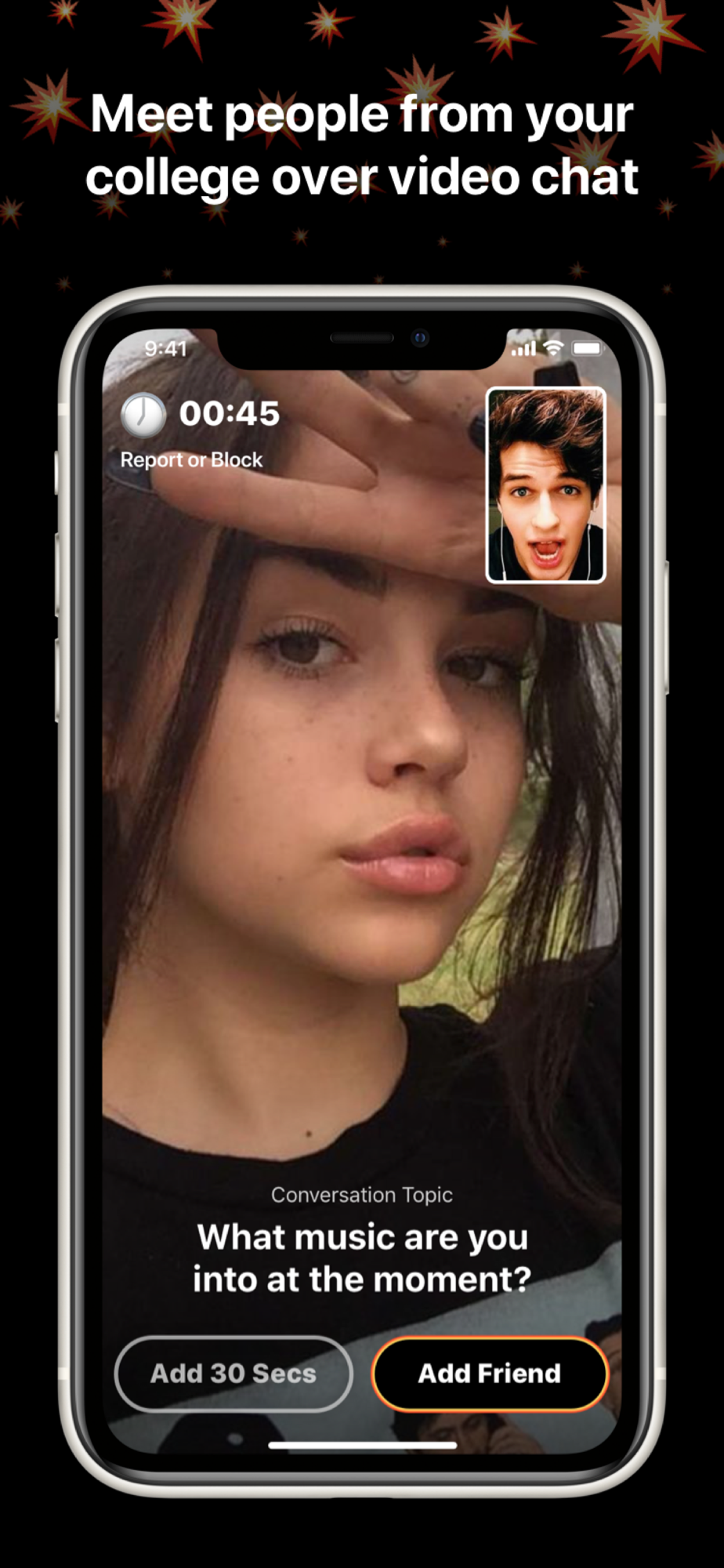 Each night at 9 pm, open Flare to match with new people from your school. We’ll suggest a funny topic and you’ll have 60 seconds to video chat with your match. If you like each other, add them as a friend to keep in touch.