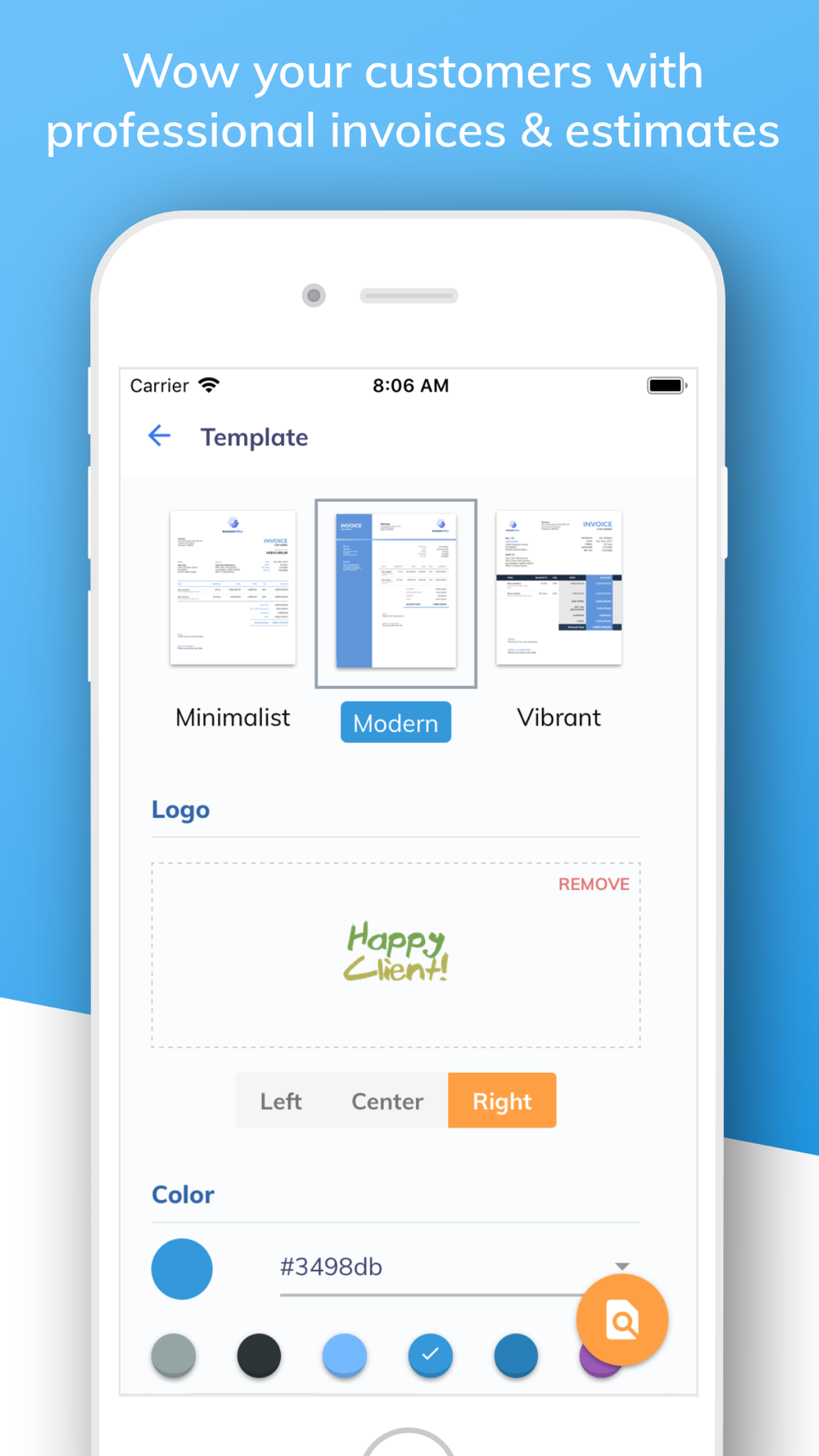 Impress your clients with great-looking estimates and invoices. Select from available templates, and brand them with your business logo and color. It just takes seconds with Invoicebillity.
