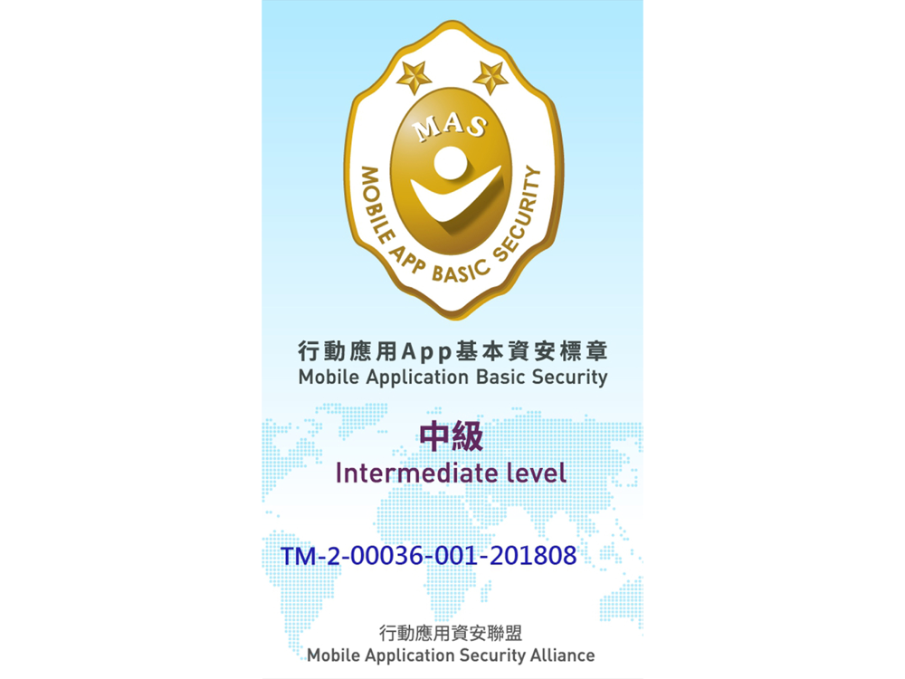 本軟體(版本:1.15)經合格實驗室檢測,符合「行動應用 App 基本資安檢測基準」(v2.1 版)」中級(MAS 標章編號 :TM-2-00036 –001-201808)。