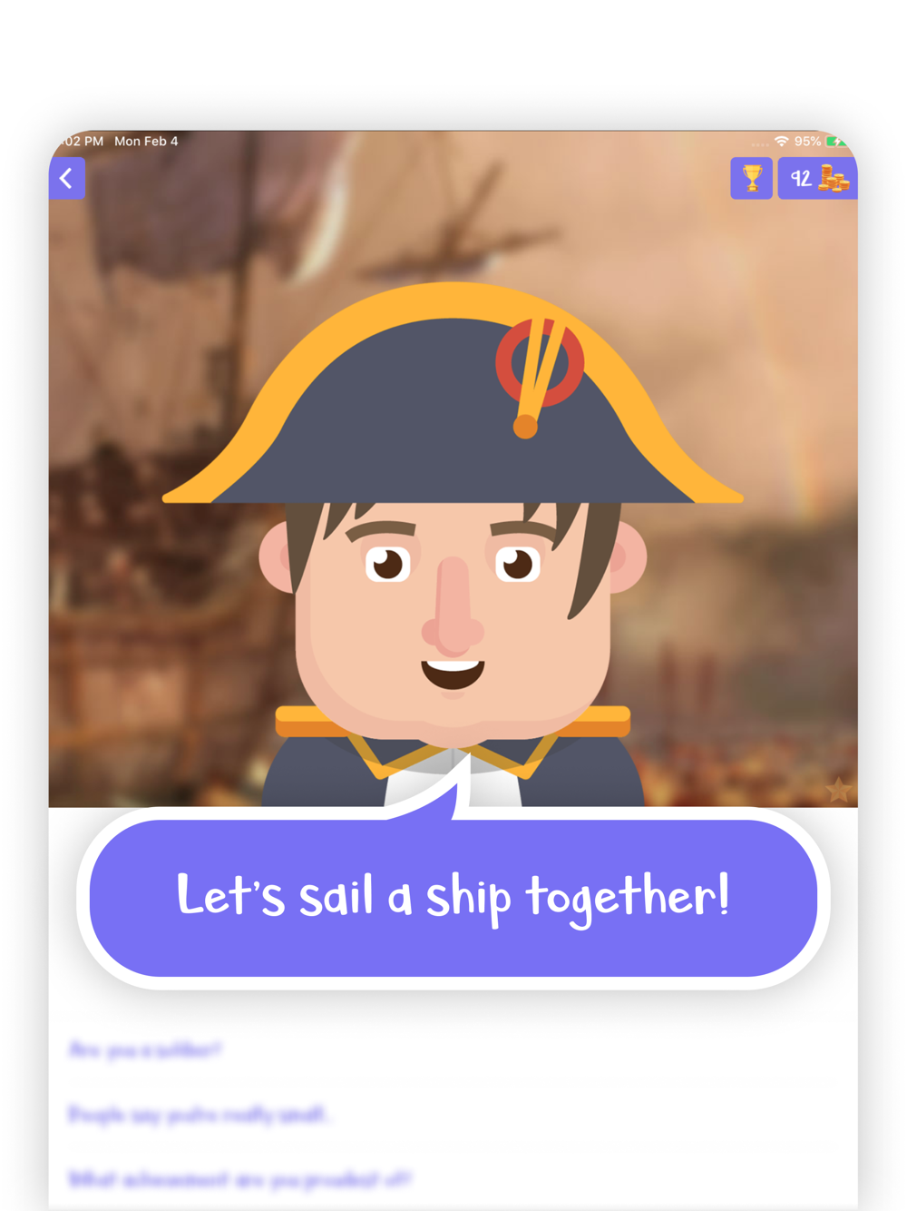 - Play-first, the app is highly gamified (character animations, character sounds, trophies, coins)