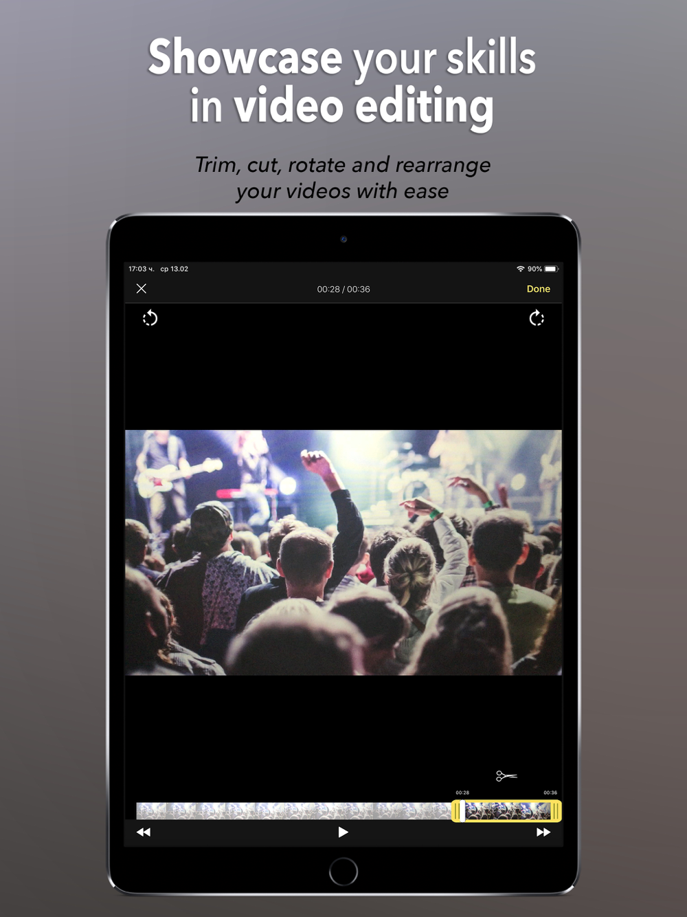 • Edit your recording from within the app - rotate, trim, cut and rearrange selected parts of the video. You can also zoom into any given area in the video for a selected period of time.