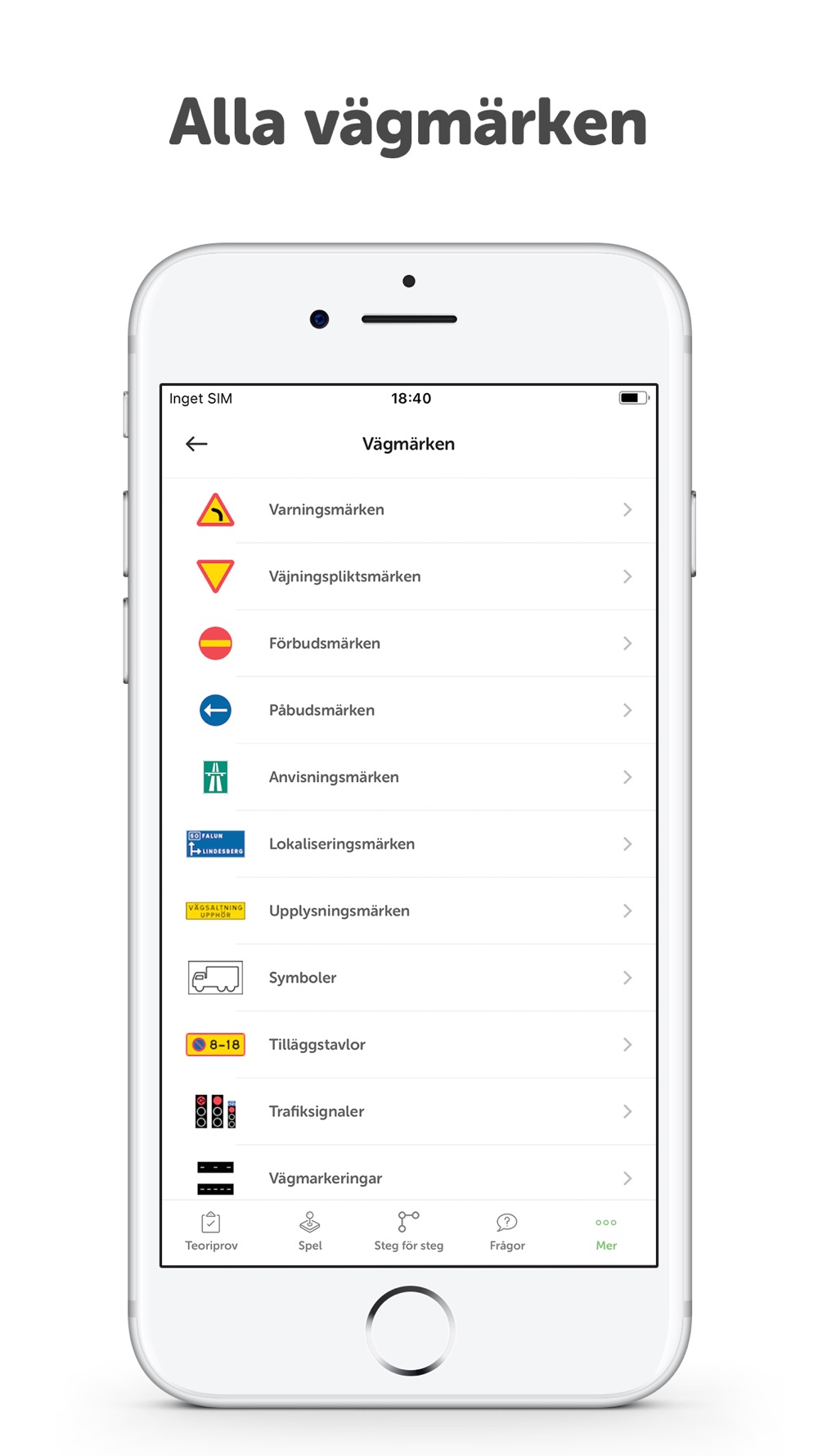Denna app gör det roligt att lära sig alla svenska vägmärken. Perfekt för dig som ska ta körkort.