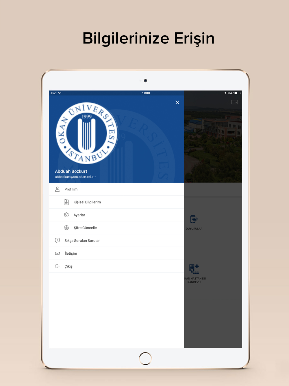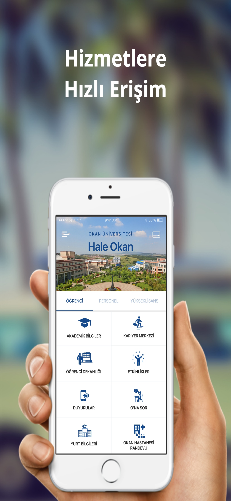 Okan Üniversitesi mobil uygulaması ile öğrencilerimizin ihtiyaç duydukları tüm bilgilere ulaşabilmeleri ve Üniversite ile iletişim içinde olabilmeleri hedeflenmiştir.