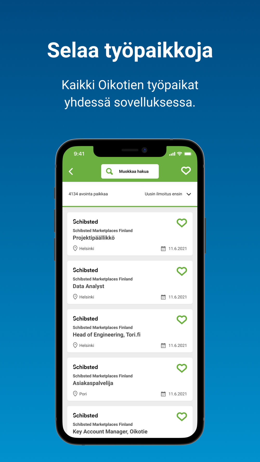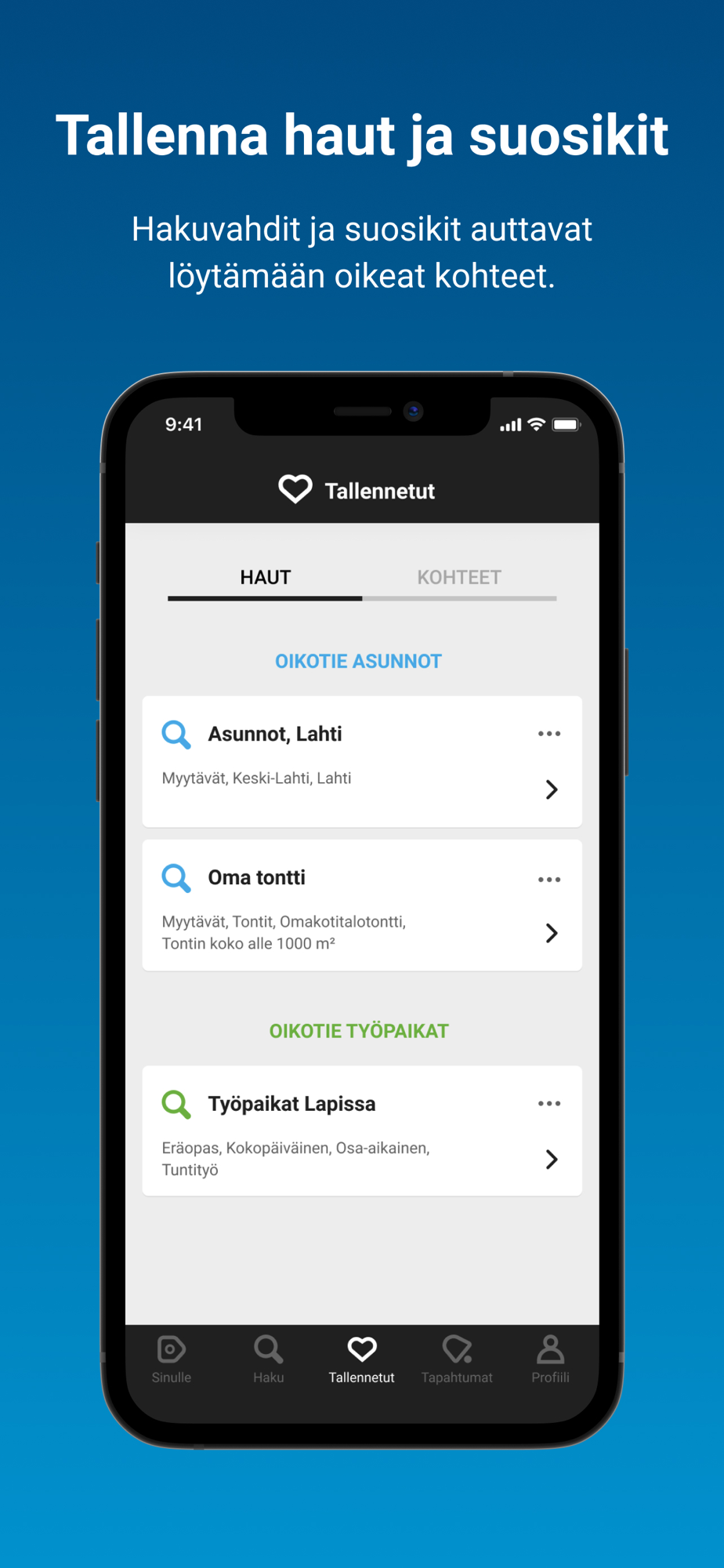 Voit yhdellä klikkauksella tallentaa ilmoituksista omia suosikki asuntoja ja työpaikkoja tai tekemiäsi hakuja. Tallennetut haut ja suosikit löytyvät helposti sovelluksesta.