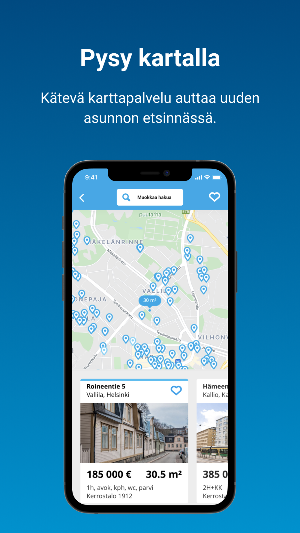 Kaikki myytävät asunnot ja vuokra-asunnot näet helposti myös käytännöllisellä karttapalvelulla. Selaa ja suodata koteja haluamallasi alueella suoraan karttanäkymässä.