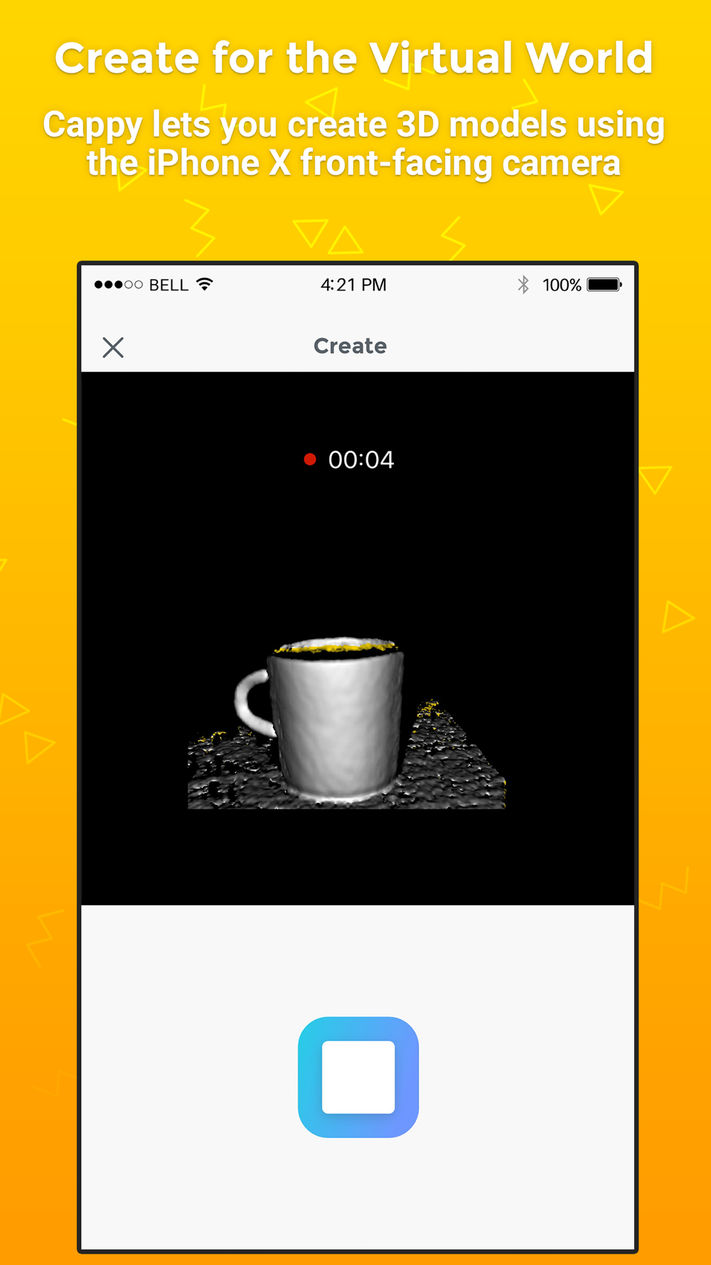 Cappy allows you to create 3D models quickly with the iPhone X, XS, XS Max or XR! Create full-color 3D scans with the TrueDepth camera. Select 3D scans from the Cappy Stream and place them into Augmented Reality. Users with other iPhones or iPads can browse and view models in Augmented Reality.