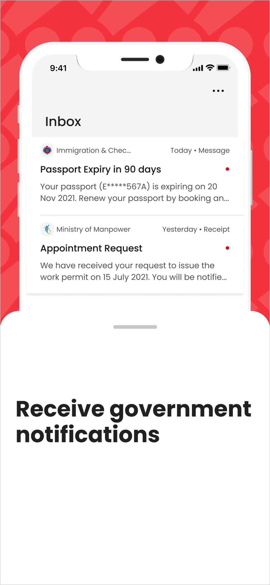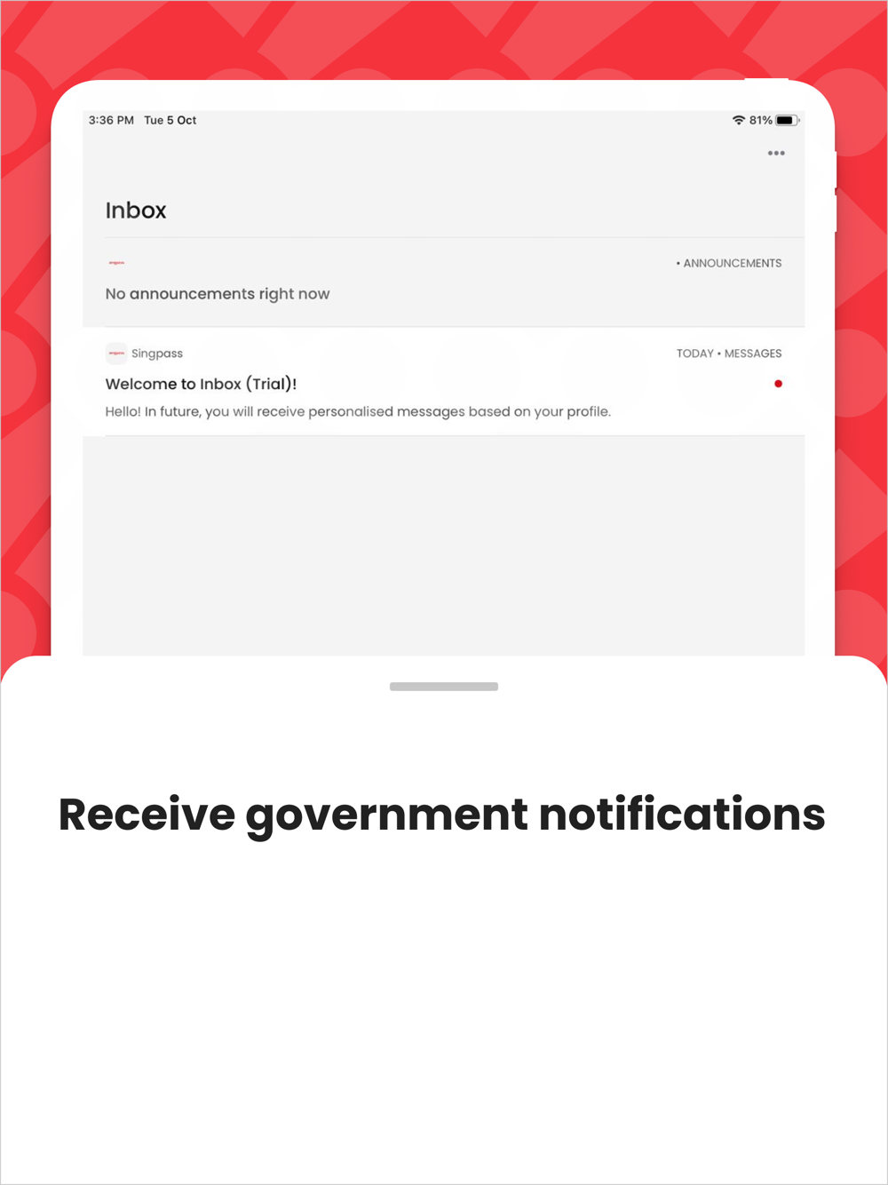 INBOX: Receive government notifications through the Singpass app inbox.