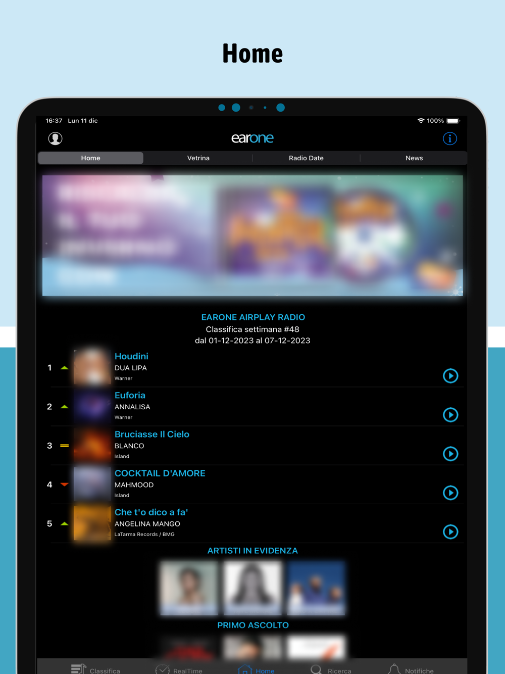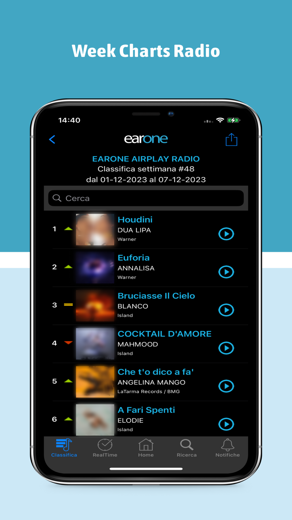 Scarica l'app ufficiale di EarOne, la società partner dell'industria musicale italiana che ogni giorno ascolta centinaia di emittenti radio, TV e web per elaborare la classifica ufficiale dell’airplay in Italia.