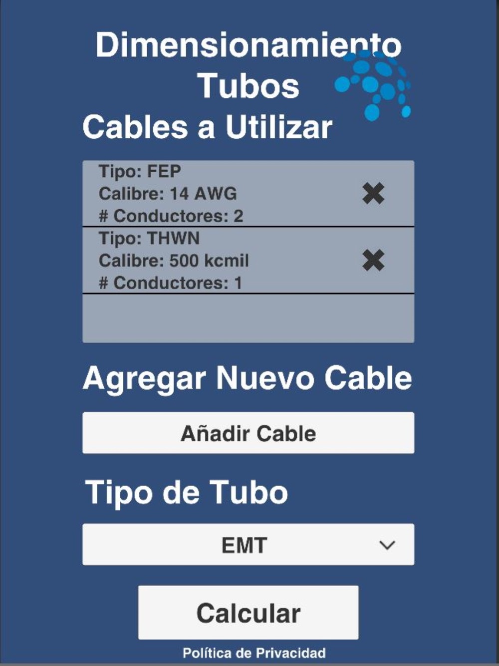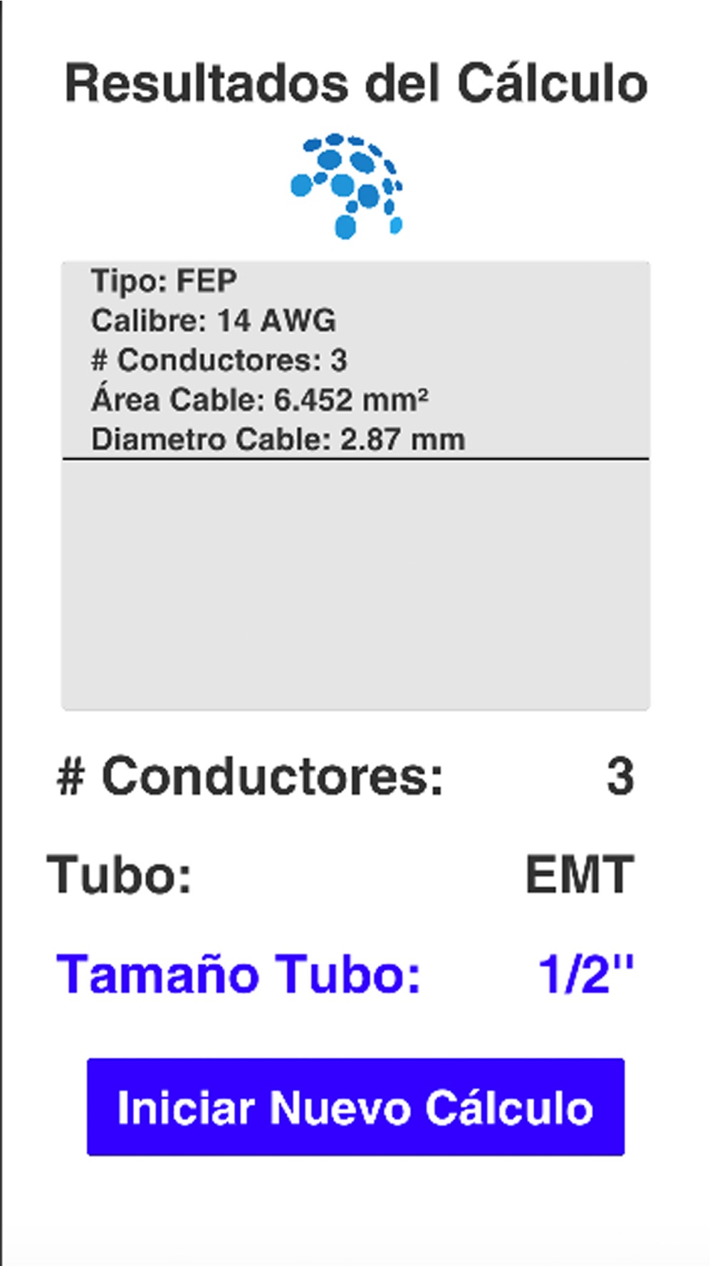 También podrá dimensionar el tubo seleccionando diferentes calibres y tipos de conductores que viajen por la misma canalización. Igualmente, obtenga la sección y el diámetro de cada conductor seleccionado.