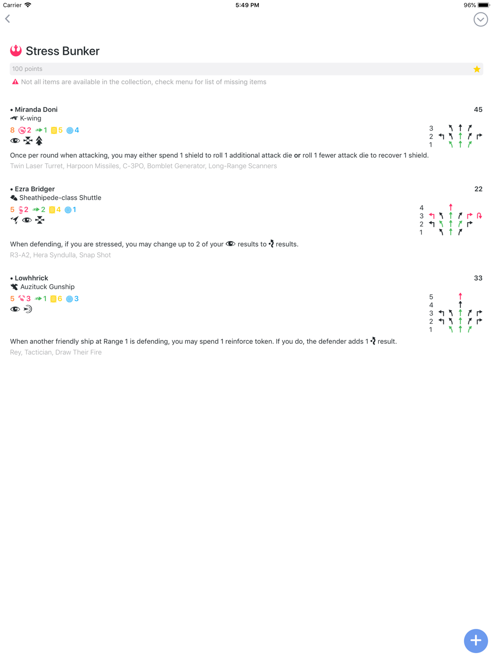 Launch Bay is a Squadron builder for X-Wing The Miniatures Game with a clean user interface, frequently updated (mostly over the air) and ability to save your squadrons in the cloud in case something happens to your phone!