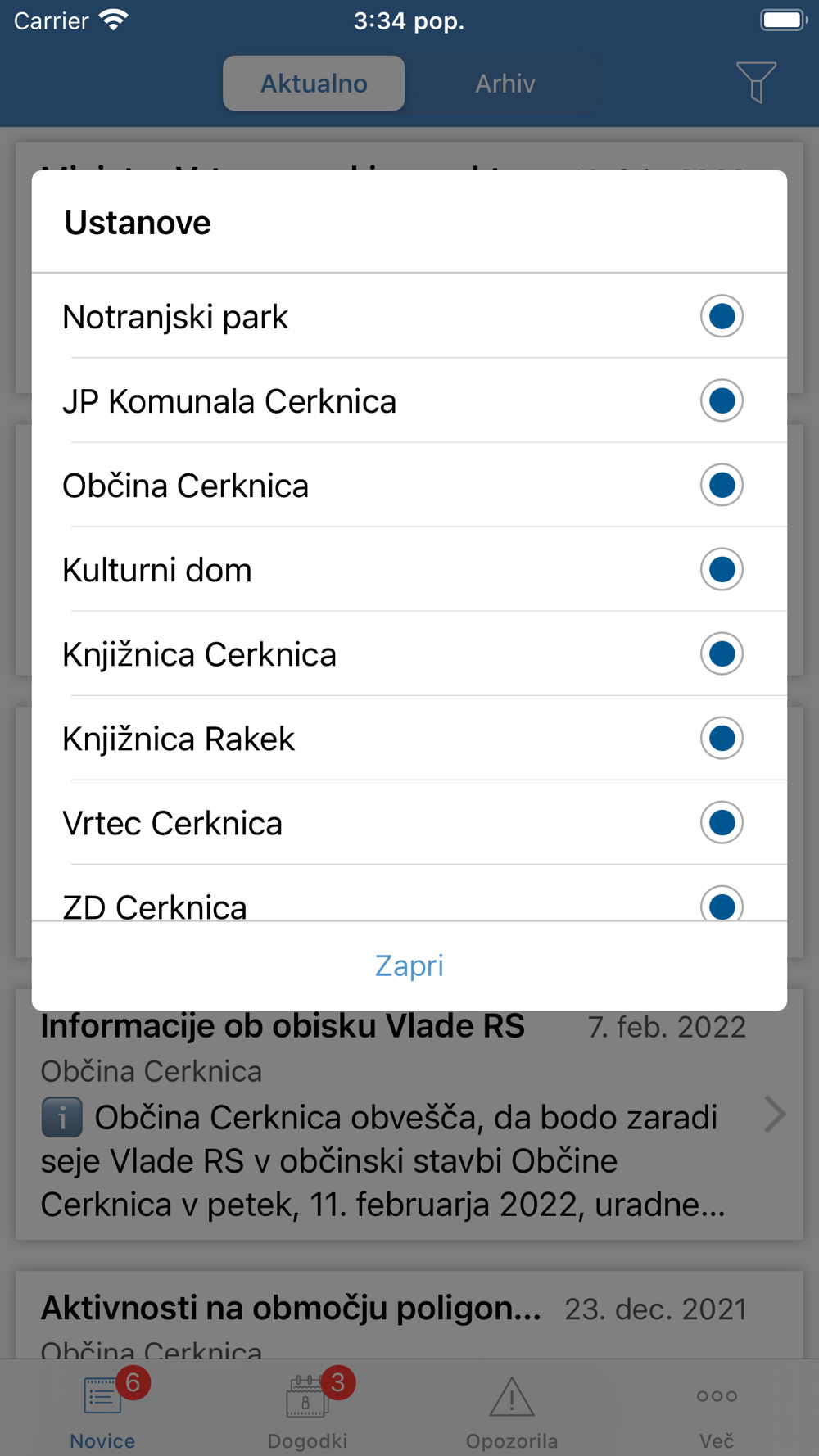 All relevant activity at public institutions and organizations from the Cerknica municipality, gathered in one app.