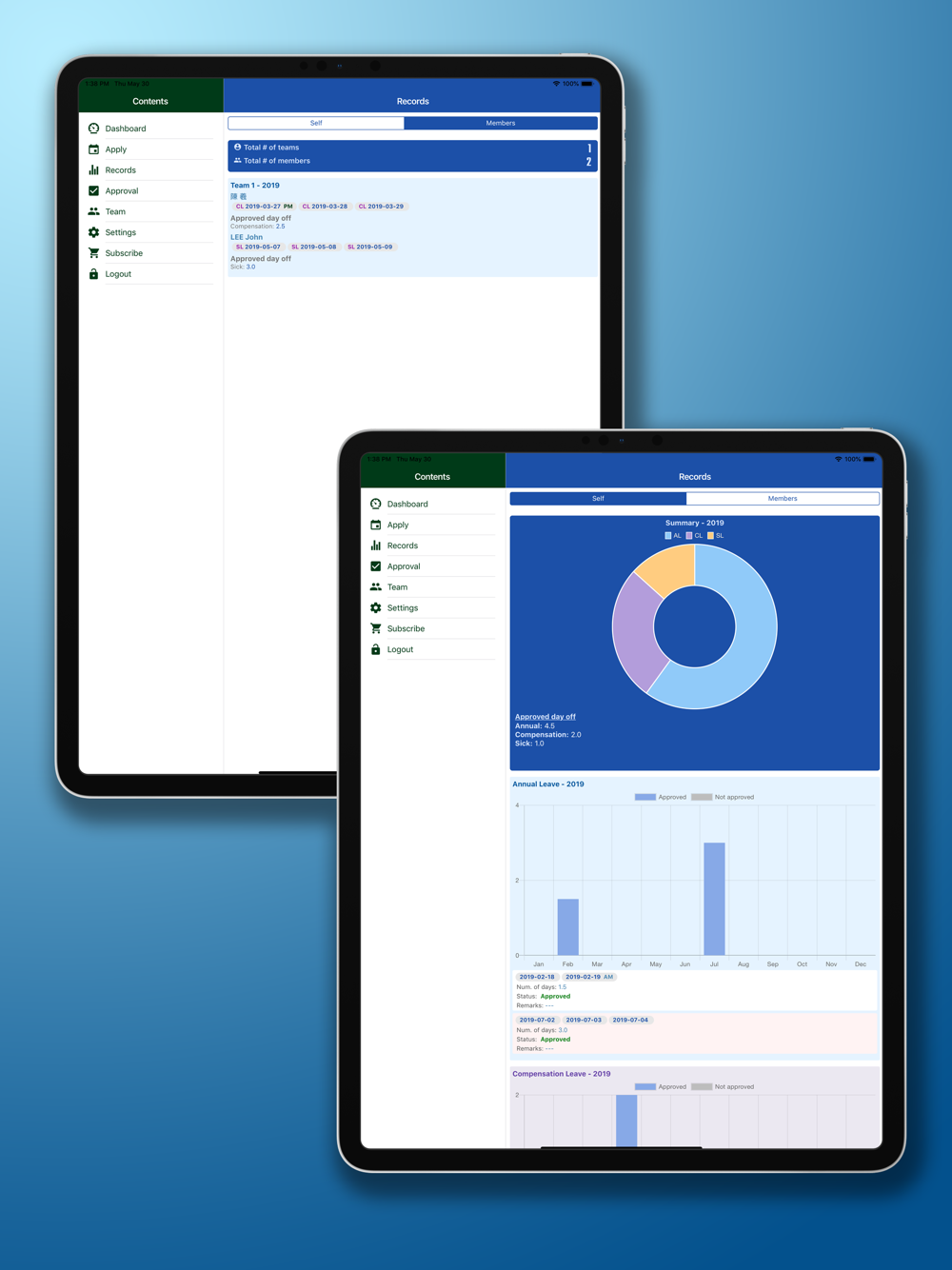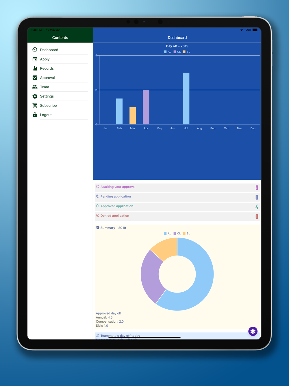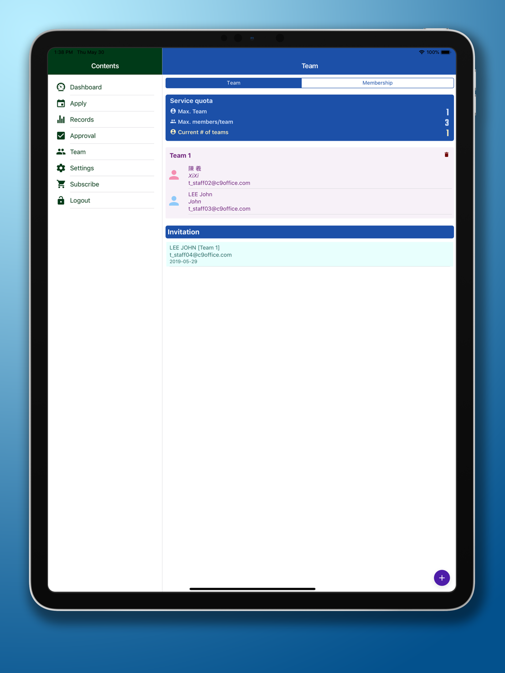 At the same time, you can also collaborate with your team and use the app as your team's day off manager. You can create your own team and invite team members to join. (The maximum number of teams and number of members per team depend on your subscription level, please login at https://www.c9office.com/dayoff and check out Setting > Profile for detail.)