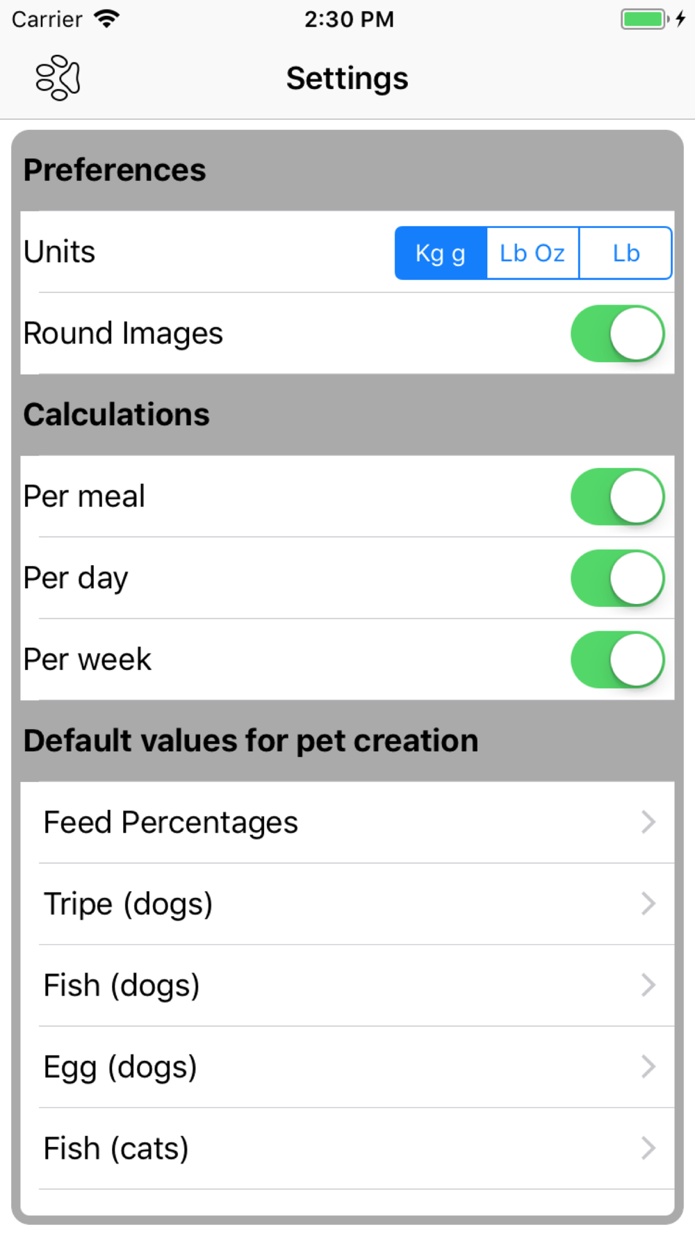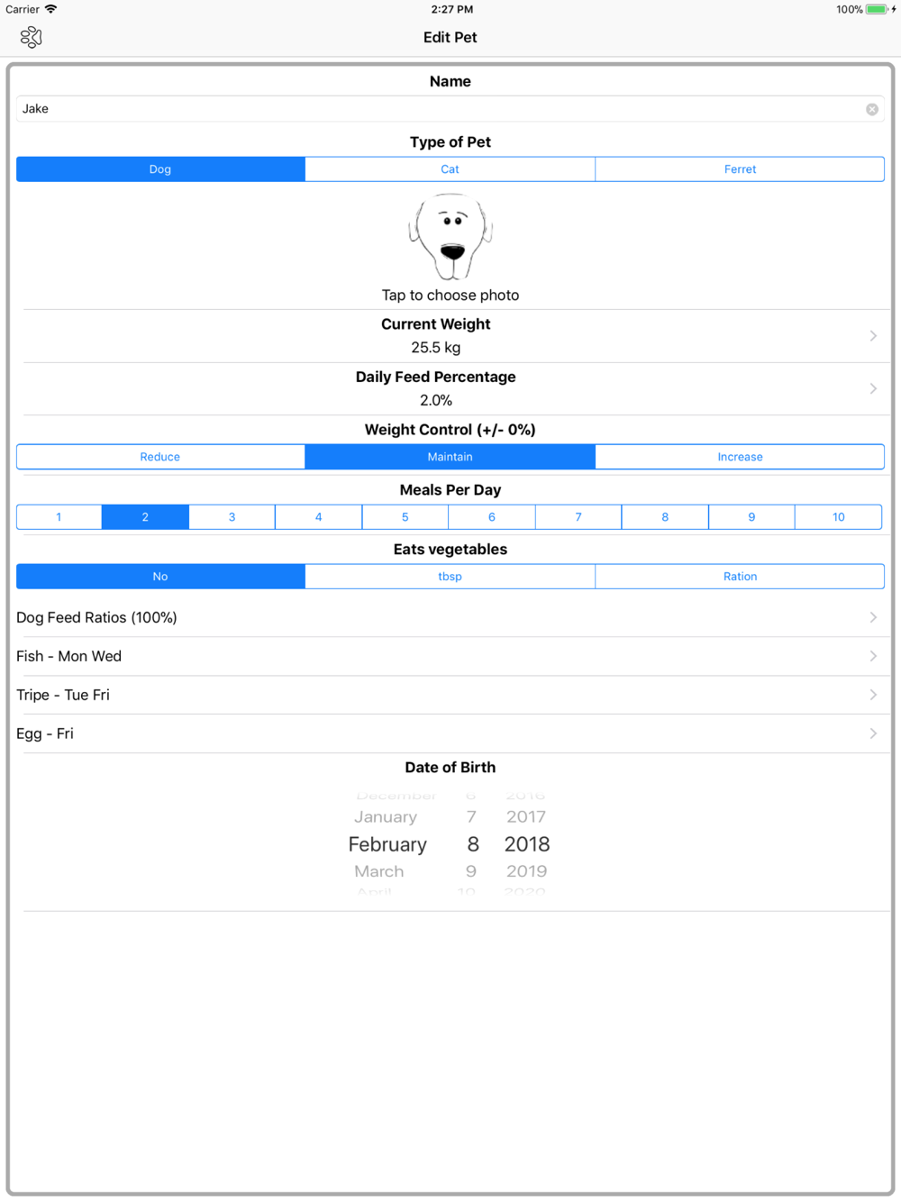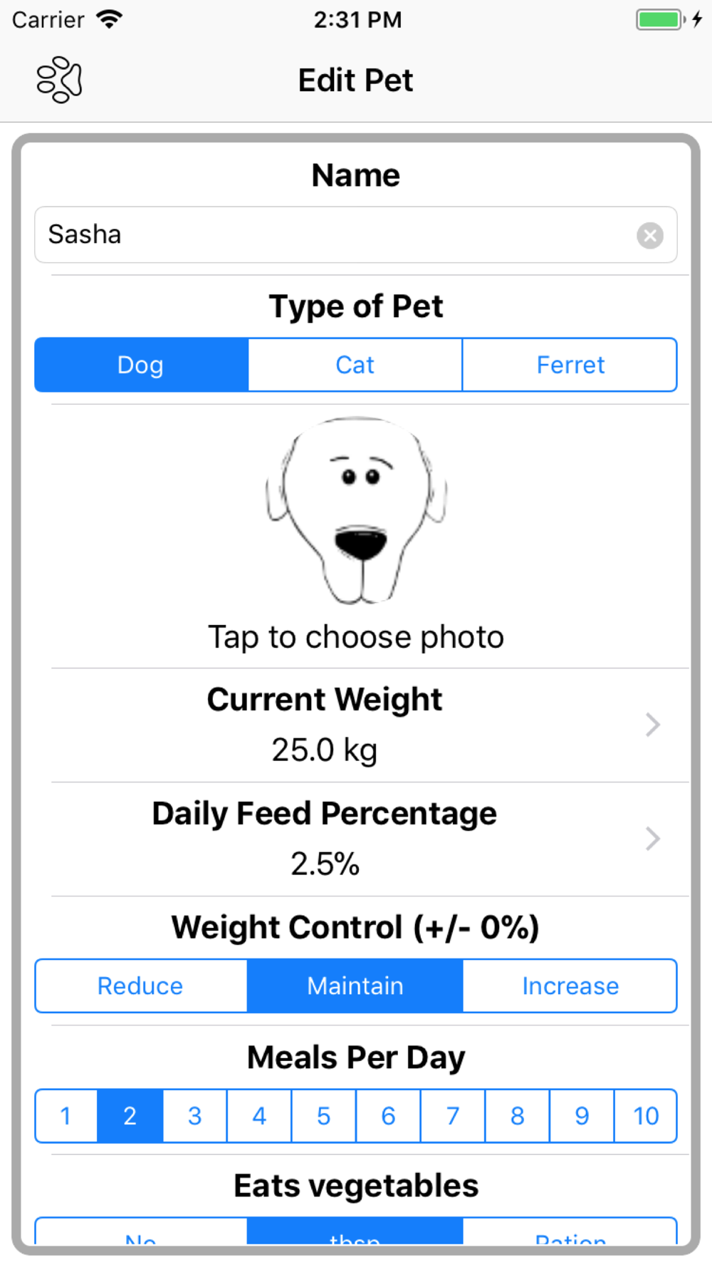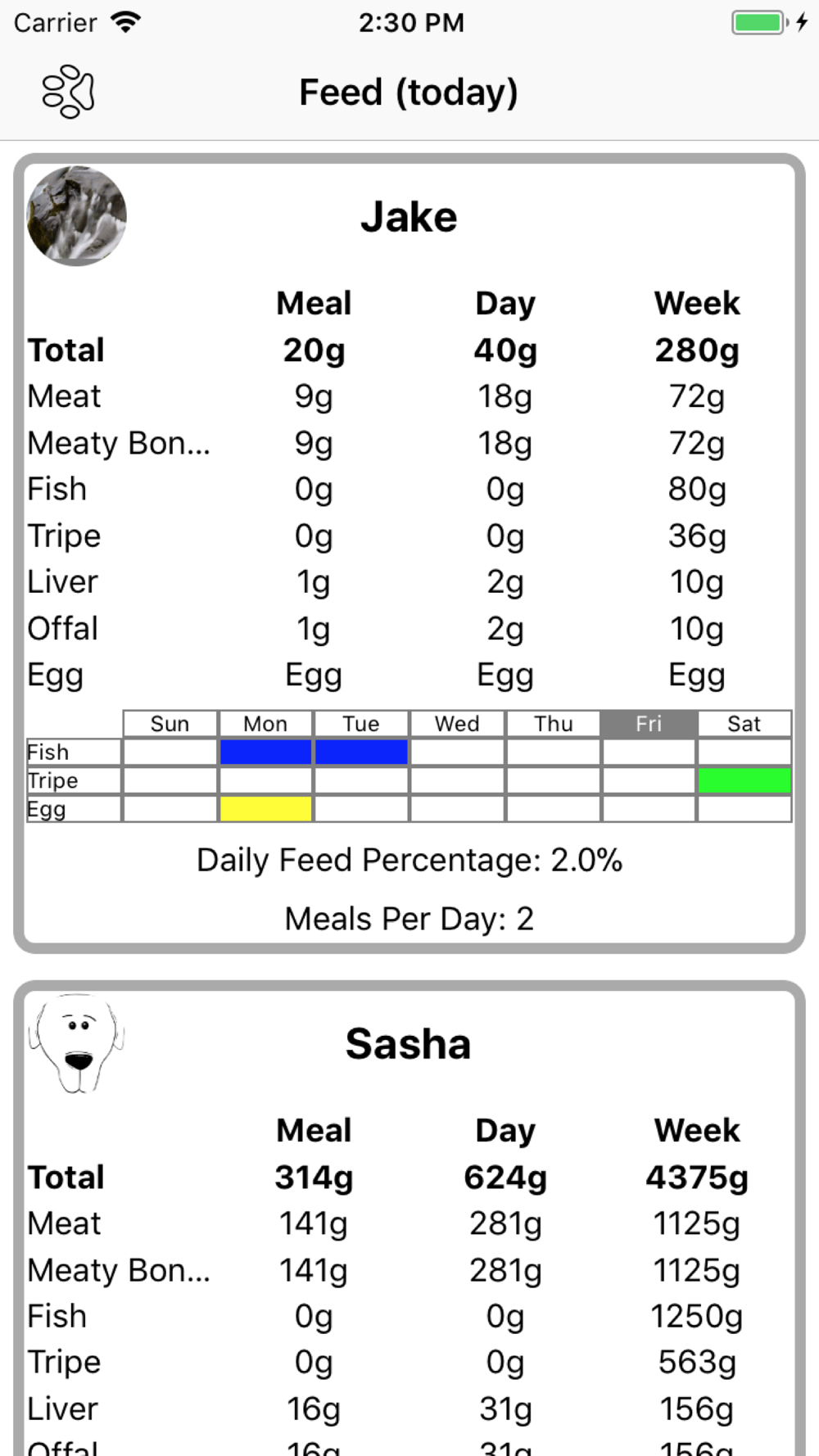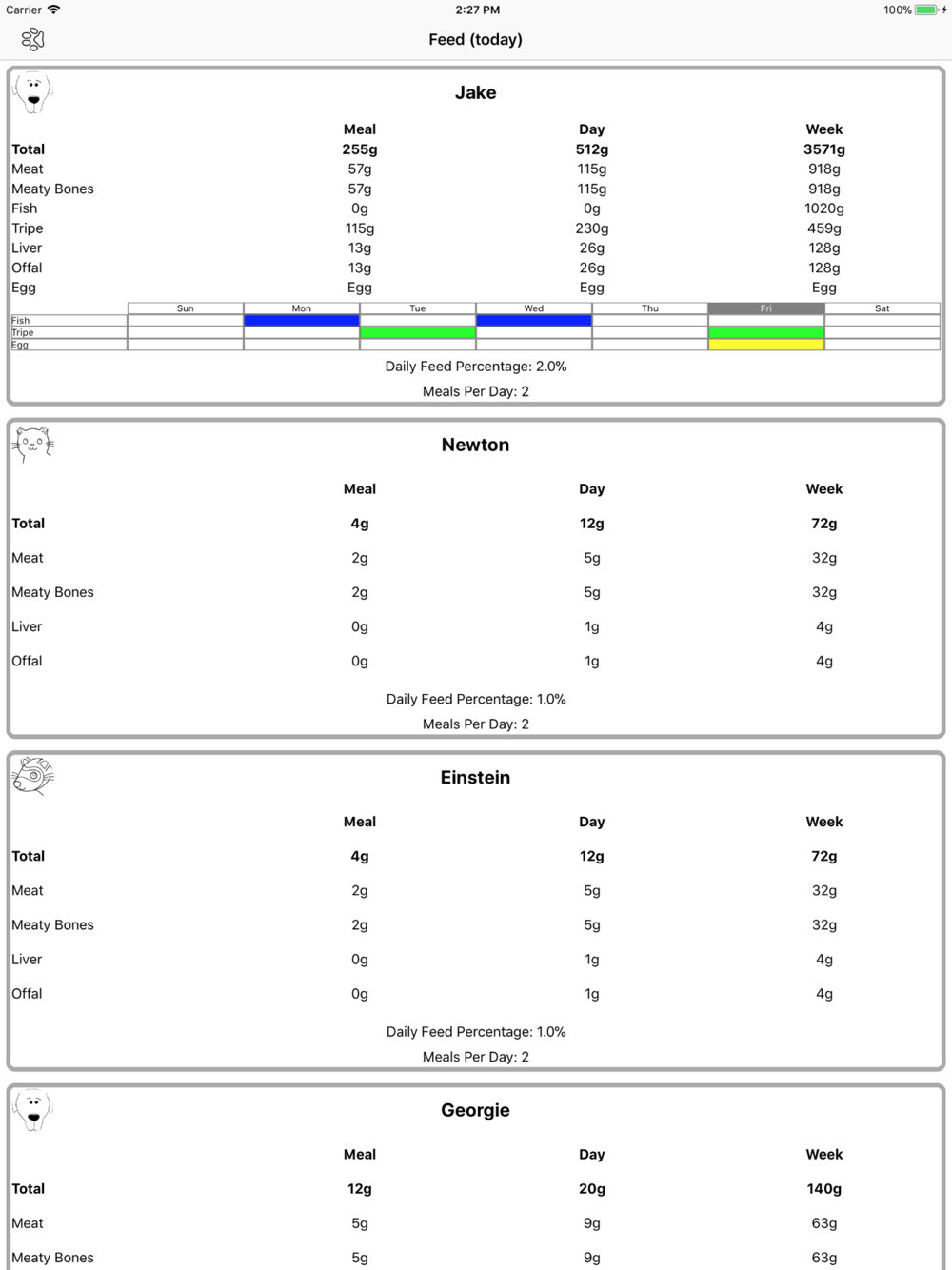 Feeding dogs, cats of ferret a BARF or RAW diet can be daunting, particularly at the beginning. Pet Dinner takes all the guesswork away and gives you the correct proportions of each ingredient for every meal. Pet Dinner adapts to your preferences and will not propose fish or tripe or vegetables or eggs if you don't want it to. If you want to spread the fish or tripe quantities across several days, it can do that too.