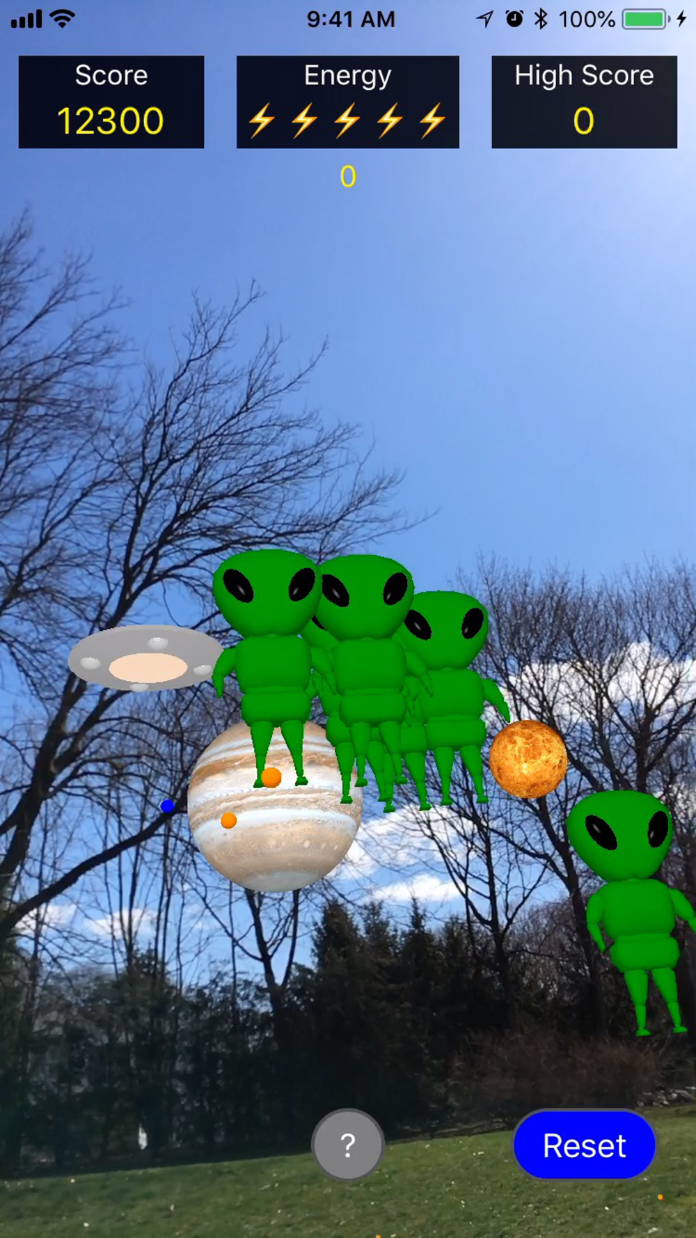 Space Alien AR is not a traditional shooting game. This is a 3D Augmented Reality game. AR enables you to play the battle game against Space Aliens in real space. You are the main player in the battle field. You can not play this game while you are sitting. You need to stand and move around physically to play this game. Your backyard is the playing field. Space Aliens land in your backyard. You have a virtual territory behind you. Your mission is to save the territory from their invasion. Space Aliens move toward your territory. They shoot laser balls to you. UFO drops laser bombs from the sky to you. Move around physically to dodge their laser balls. Hide behind virtual walls to avoid their attacks. Tap the screen to shoot laser balls to Space Aliens and UFO. Eventually the king of Alien appears. Keep trying to shoot at the king of Alien until he flies away.