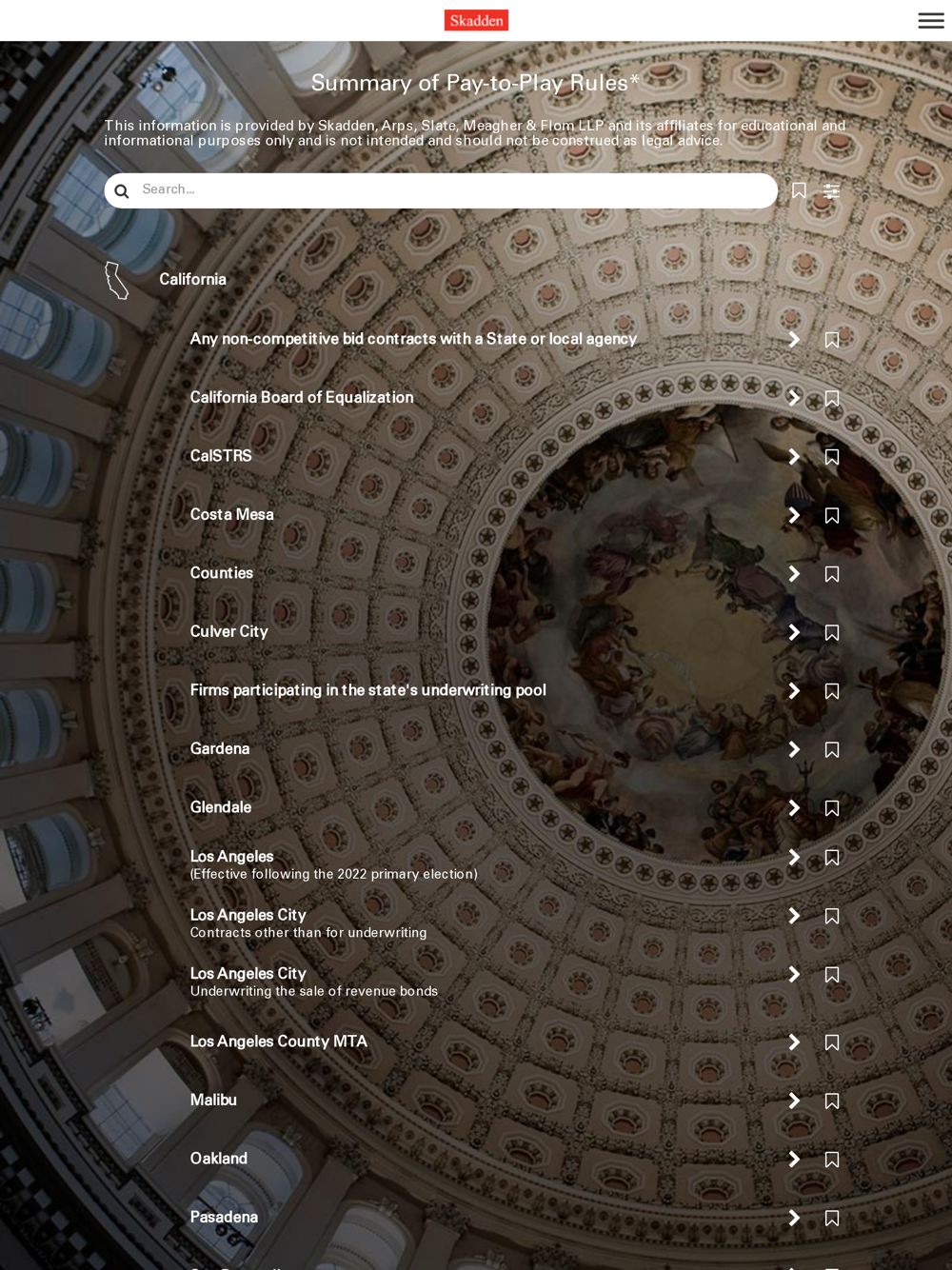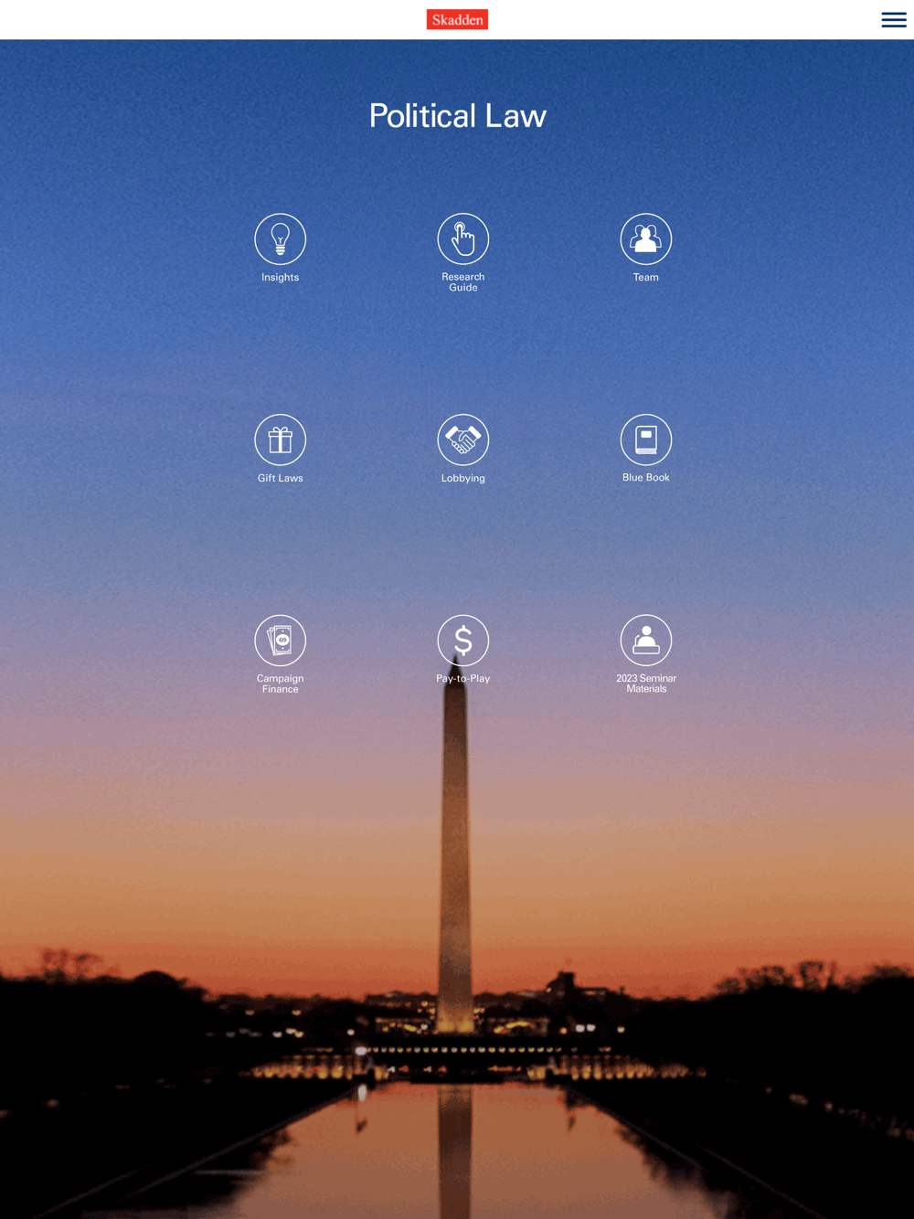 Skadden provides a wide range of political law advice, with particular emphasis on campaign finance, pay-to-play, ethics, lobbying and conflicts of interest in connection with federal, state and local laws. To provide real-time information on happenings in political law compliance, we are pleased to offer this resource app that includes our client alerts, links to government agencies and contact information for our political law attorneys.