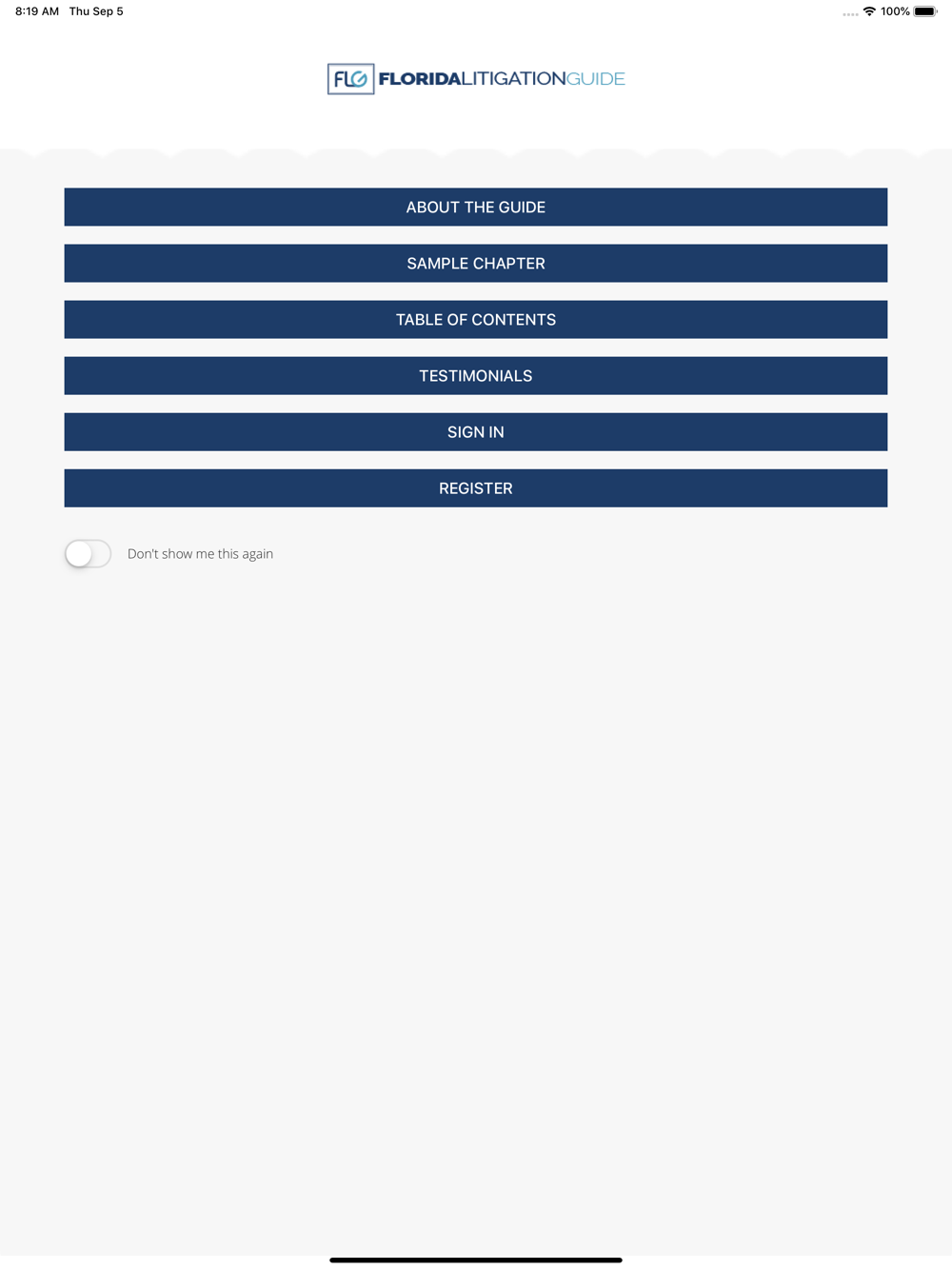 The Florida Litigation Guide is an invaluable online tool for litigation and transactional attorneys. The Guide provides for more than 70 common law causes of action (1) Each action’s elements; (2) The most recent state and federal cases that cite the actions’ elements; (3) links to the case law cited in the Guide, (4) The applicable statute of limitations for each action; and (5) Defenses to each cause of action. The App will allow lawyers to use the Guide on and off-line, while at their desk, in court, or on the go.