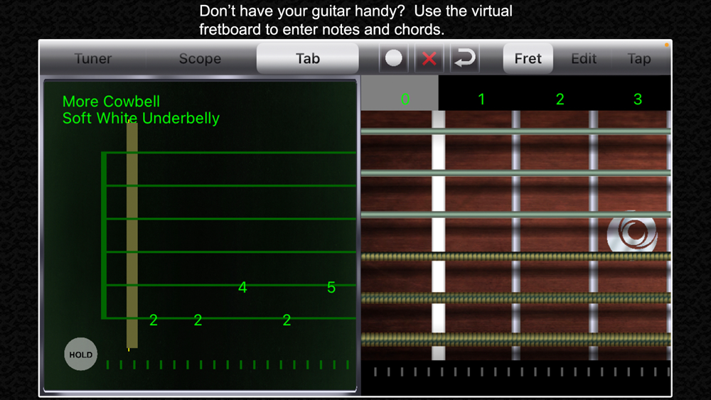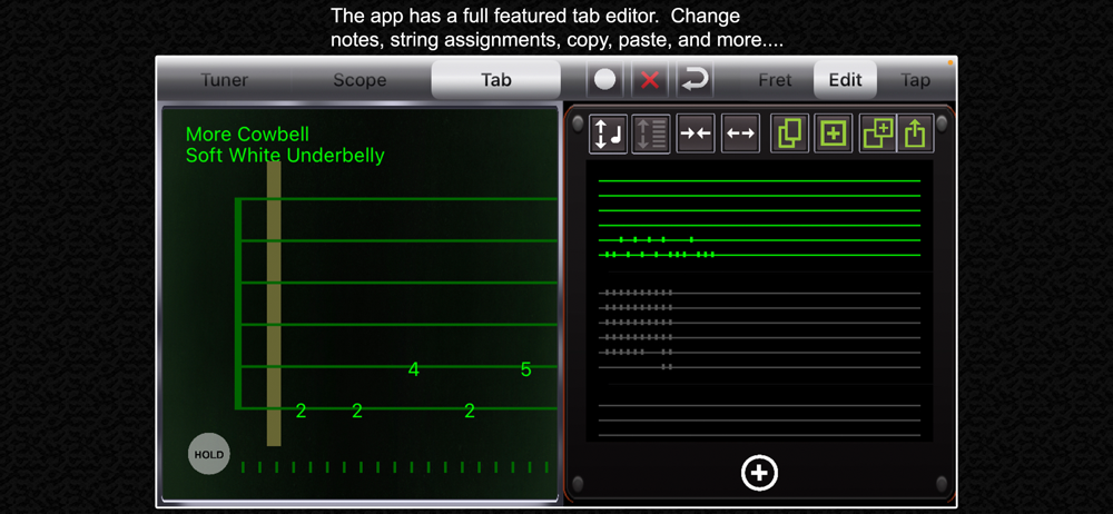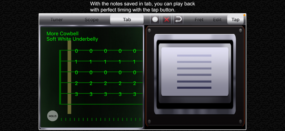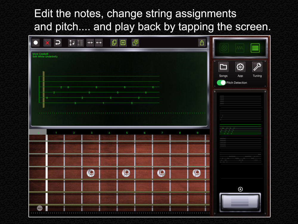 The fast pitch detection is combined with a full featured tablature editor; use your guitar or bass to jot down the notes from a solo you're figuring out, or a riff you came up with. You can keep your hands on the instrument and just play, instead of searching for a pencil and paper. The app is fast enough to transcribe in real time, as long as you're not shredding like Yngwie Malmsteen. Sorry, Yngwie.