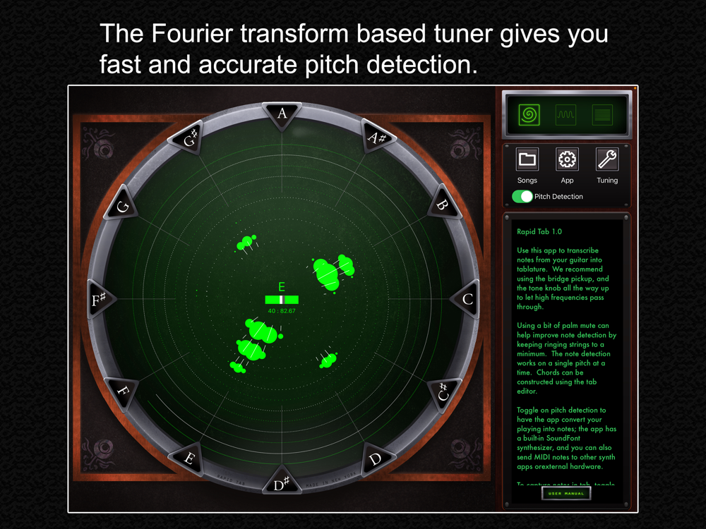 The latest iPhones and iPads are fast enough to detect pitch quickly; it's why so many guitarists use tuner apps on their phones. Rapid Tab takes things to the next level; using an advanced Fourier Transform analysis, coupled with harmonic sequence analysis, the app can determine the pitch of any note quickly and accurately.