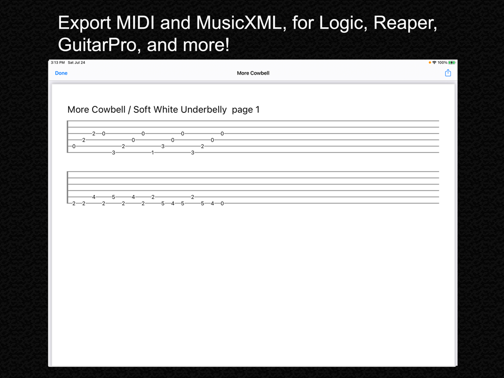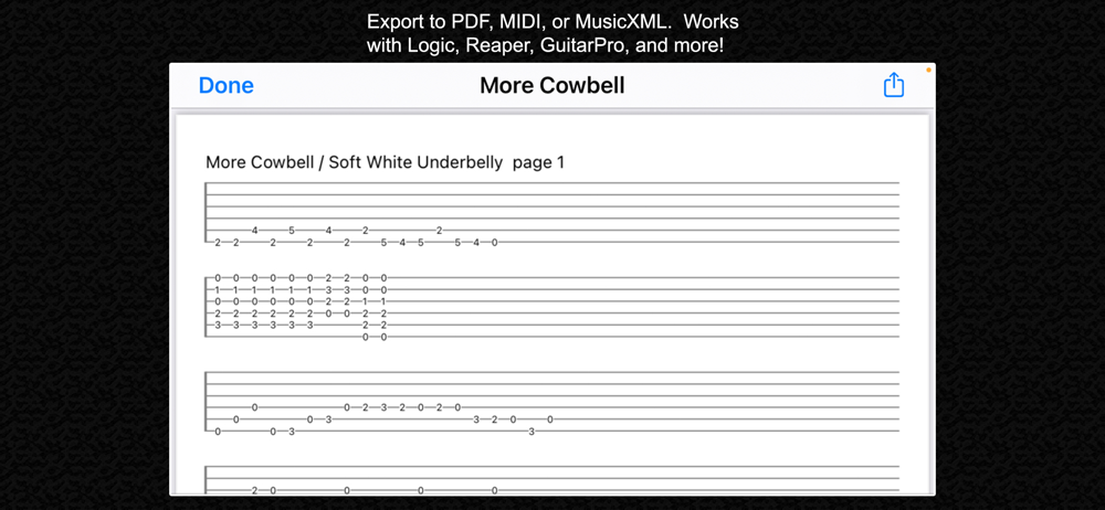 The app will export to PDF, MIDI, and MusicXML. You can import your transcriptions into Logic Pro, Reaper, GuitarPro, and hundreds of other DAWs and sequencers.