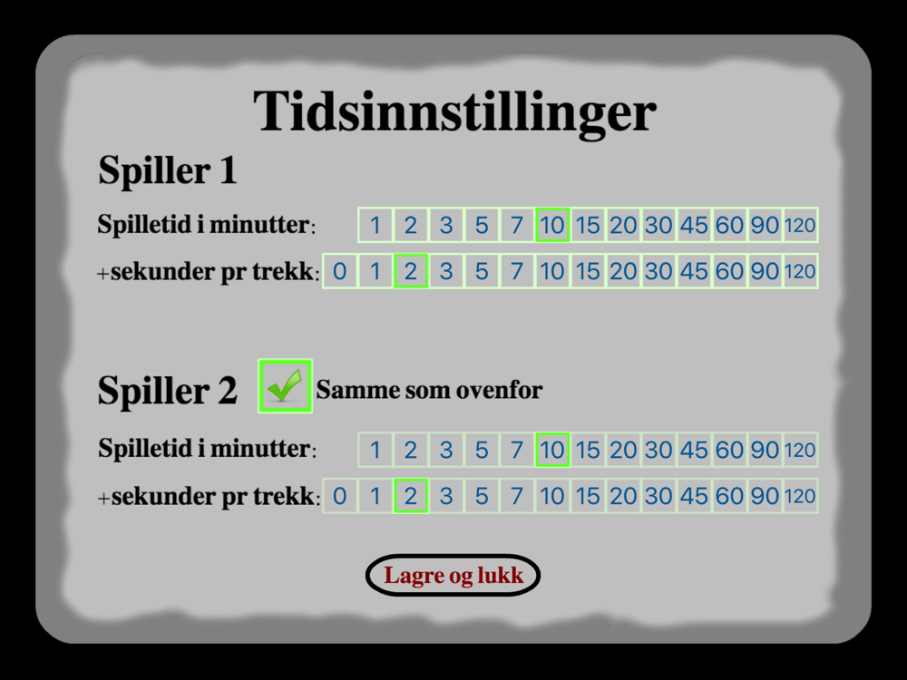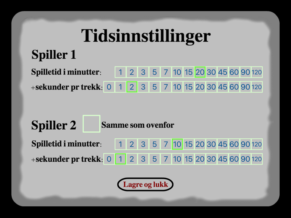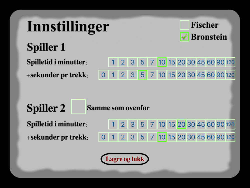 - Velg mellom Fischer eller Bronstein når dere får tilleggstid pr. trekk.