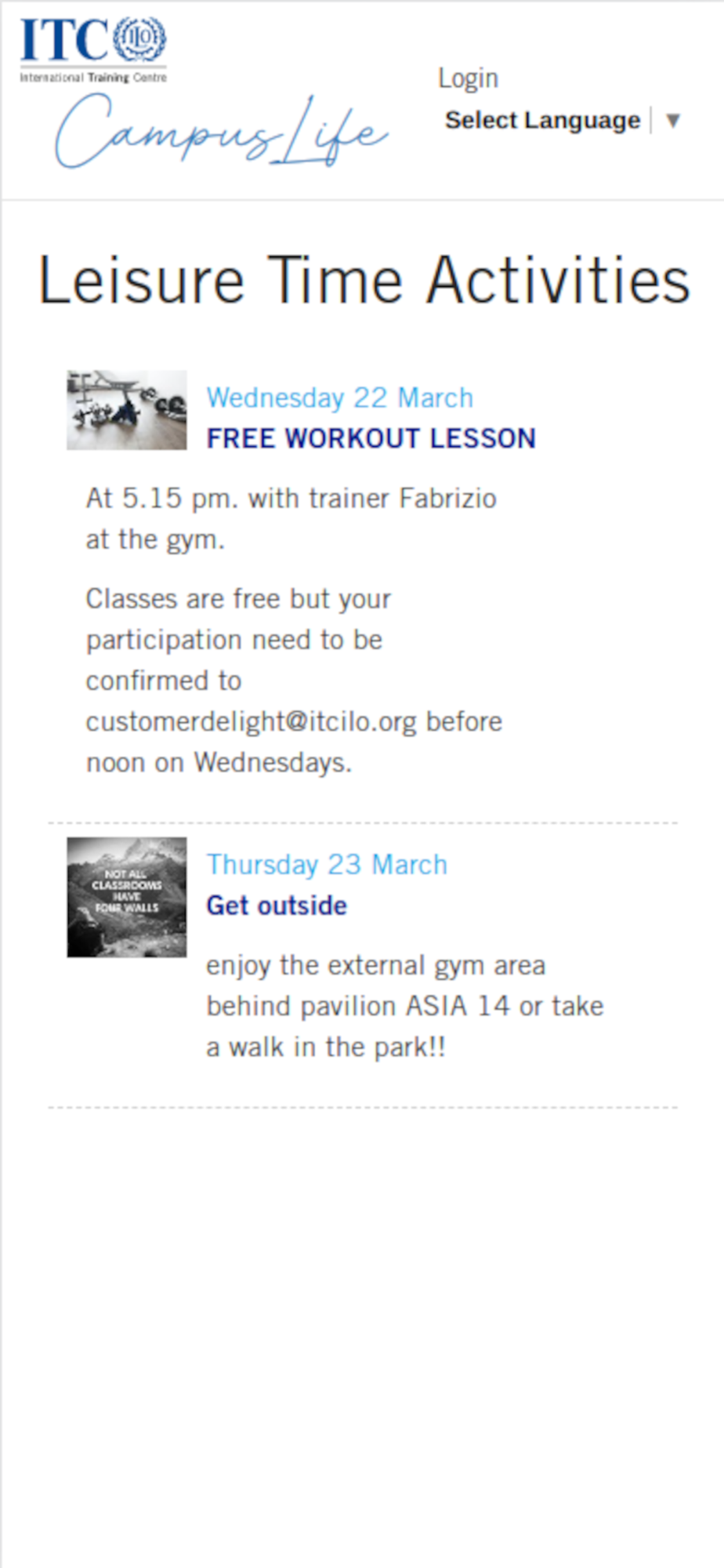 The Campus Life portal contains up-to-date information such as directory of services, training activities, leisure time activities, restaurant menu, weather and travel info. It is accessible from the App but also through the web at https://campuslife.itcilo.org.