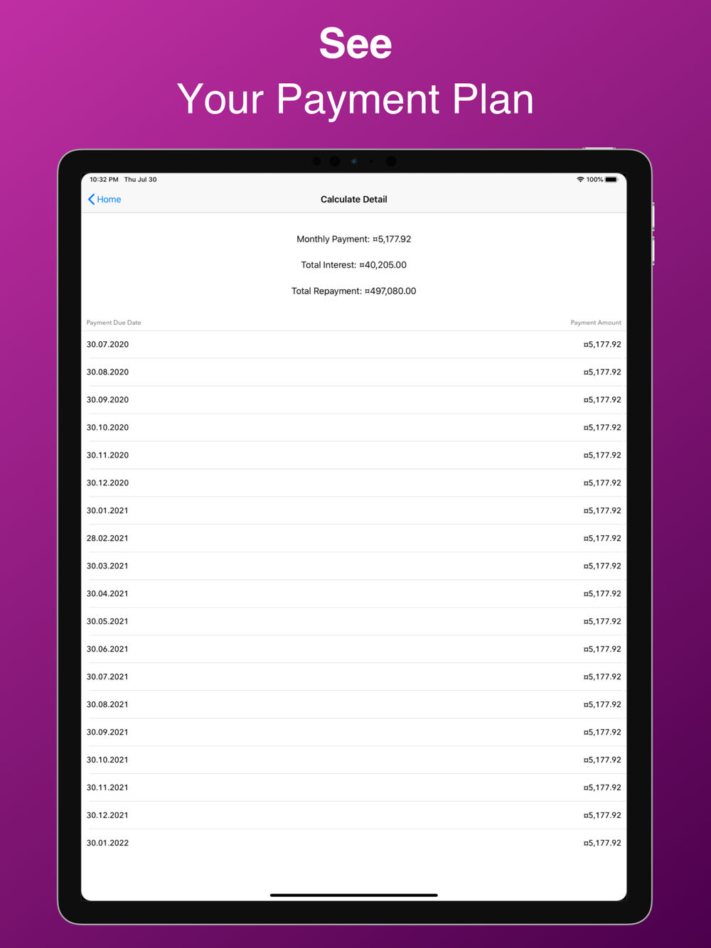 In the Calculate Detail section, you can see the monthly payment, total interest, and full repayment. You can see the monthly payment schedule of your loan payment and make your loan plan accordingly.