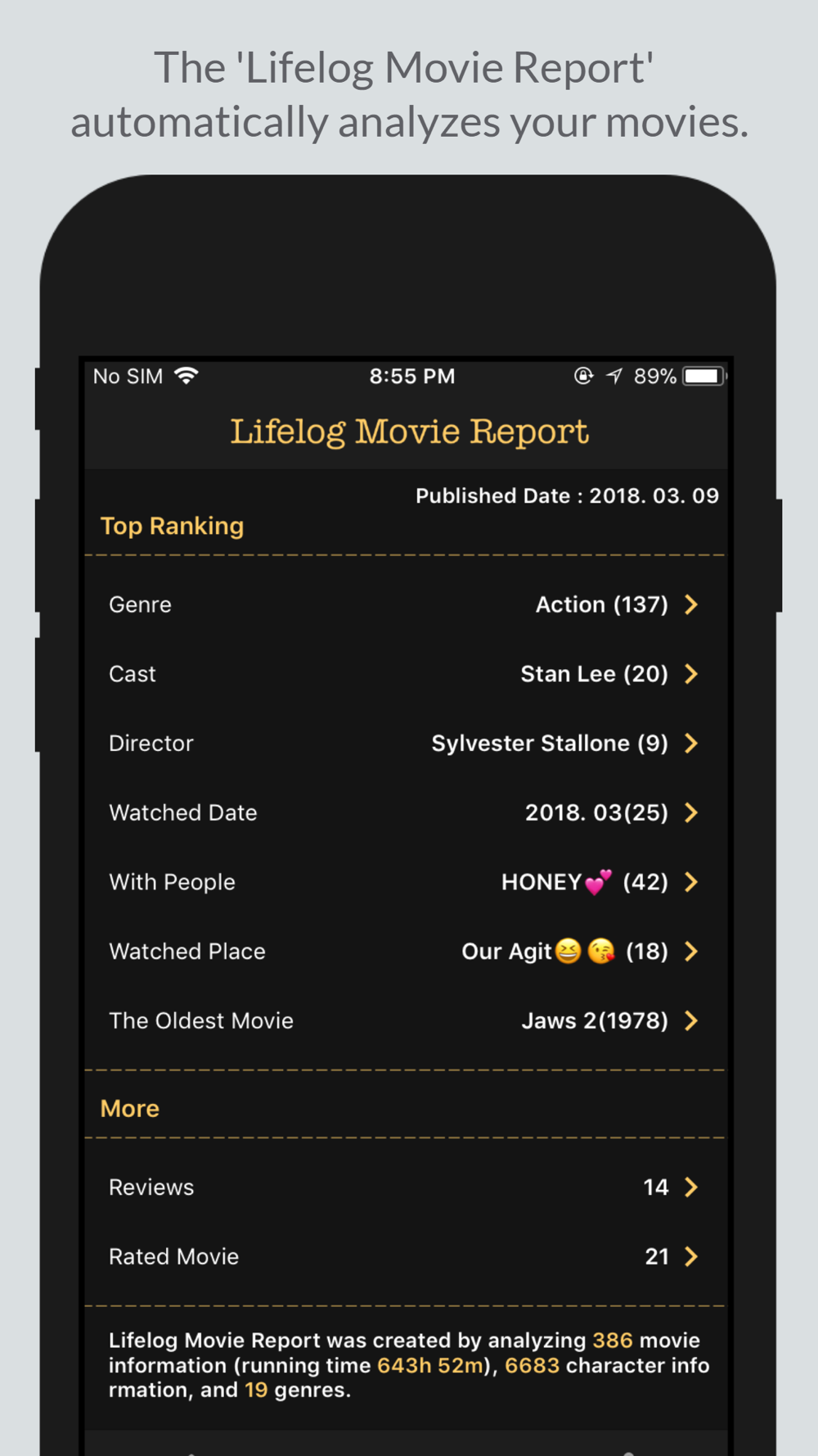 After registering various different movies you've seen, try generating a "Lifelog Movie Report". You can take a look at diverse statistics based on recorded review information and registered movie information.