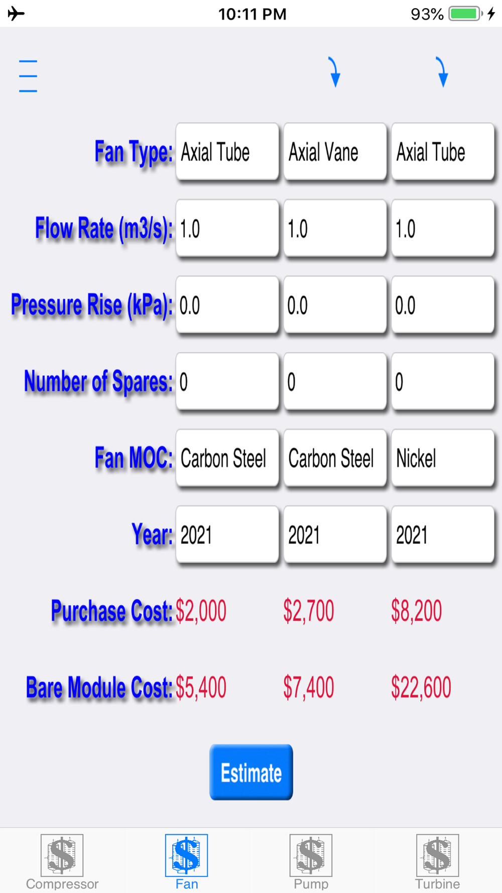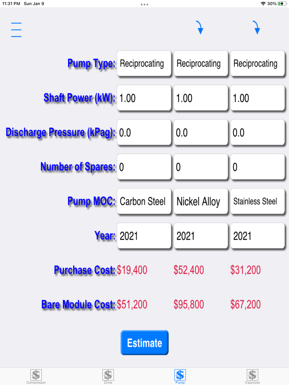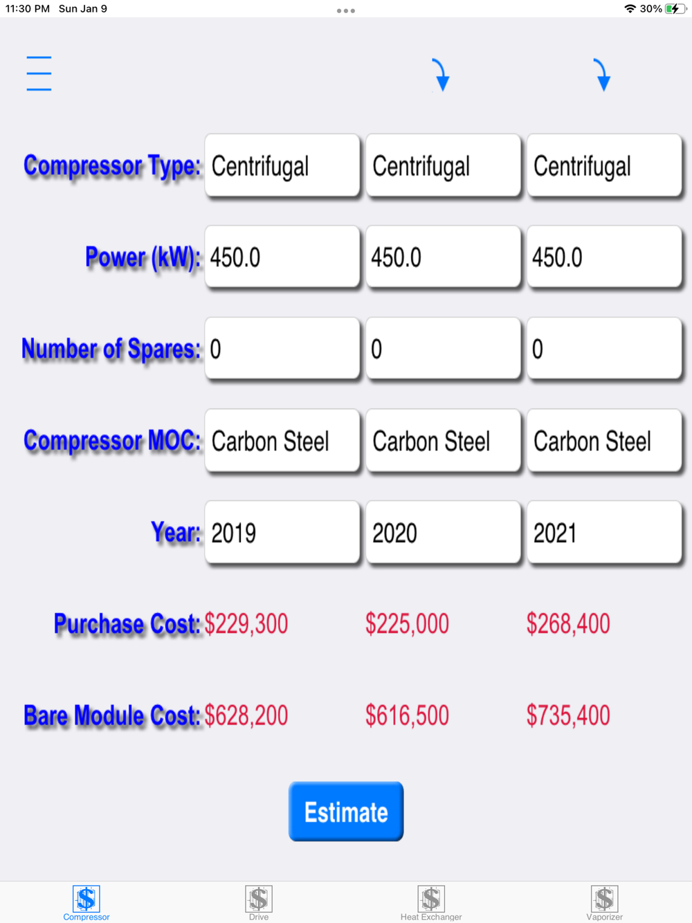 • All affecting parameters, i.e. type, capacity, pressure, temperature, materials of construction, and inflation are taken into account.