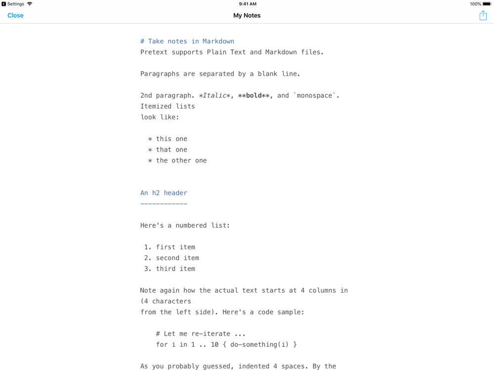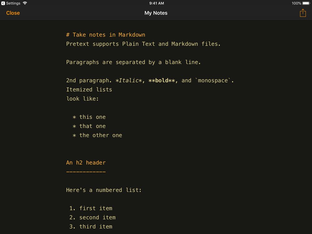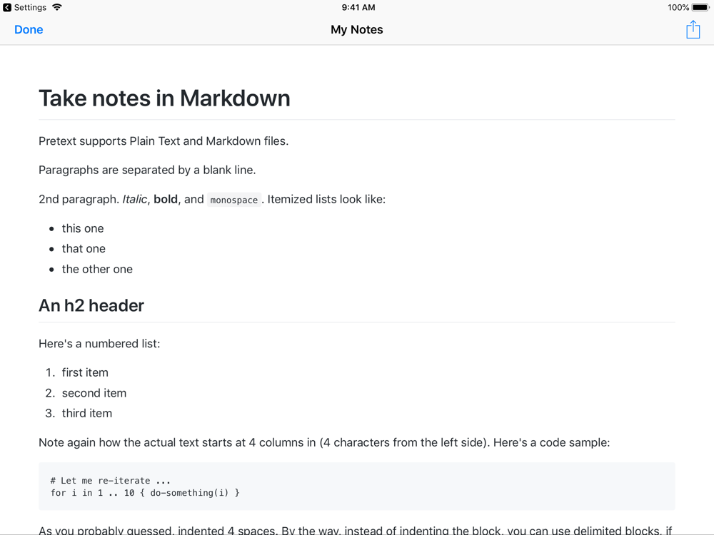 Pretext works great on all your iOS devices. Thanks to comprehensive keyboard shortcuts, Pretext works especially well with iPad Pro and Smart Keyboard.