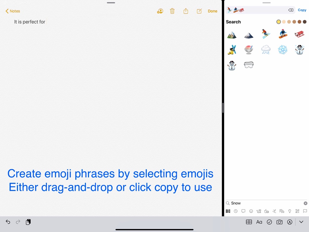 - Just drag and drop from Emojise in full screen, split screen or slide-over window.