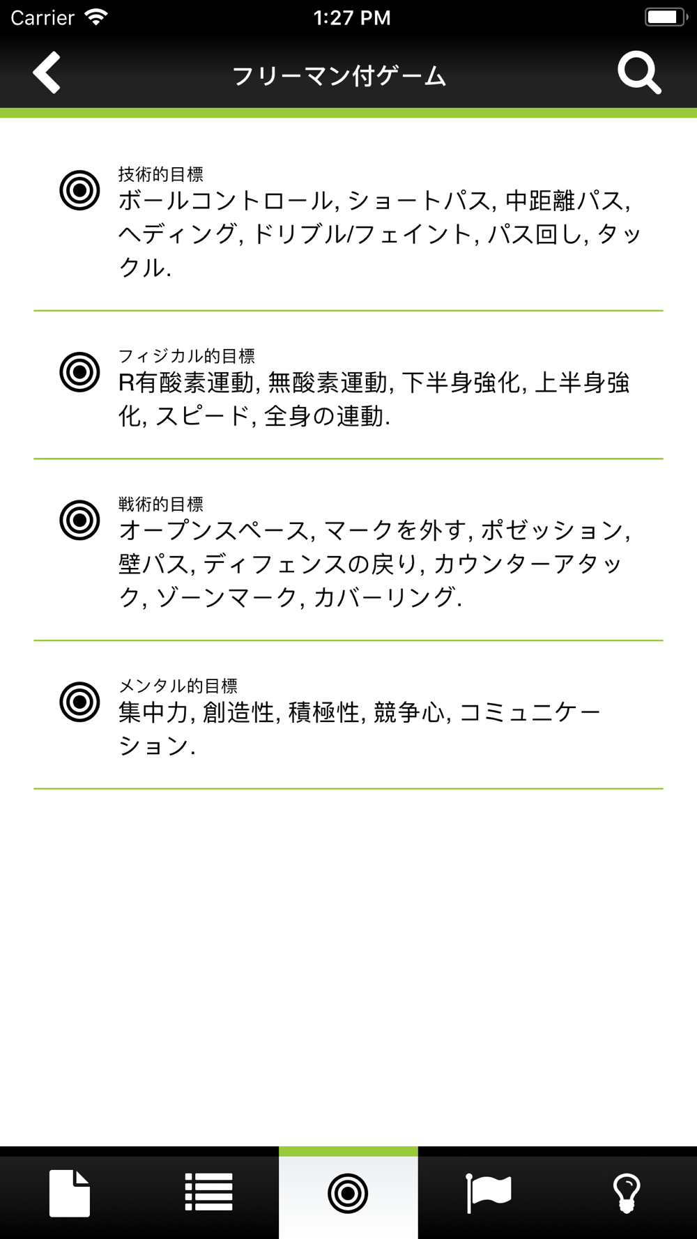 内容に応じたカテゴリー分け、戦術、技術、フィジカル、グローバ ルトレーニング、専門的、メンタル、ポジション別、セットプレー