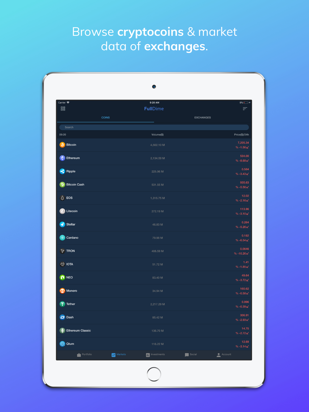 FullDime is a bitcoin & cryptocurrency portfolio tracker app with various features. Keep track of all cryptocoins, including Bitcoin, Ethereum, Ripple, Litecoin and over 1000 altcoins. Use the app free to get the latest coin prices, volumes , charts and set alerts to make sure you don't miss the investment opportunities. If you wish add your investments to Fulldime from different exchanges like Bitstamp, Binance, Bittrex, Kraken etc. to track your profit and losses from single app. Follow market influencers, share your ideas with people who have similar investments and interests with you, change ideas with them.