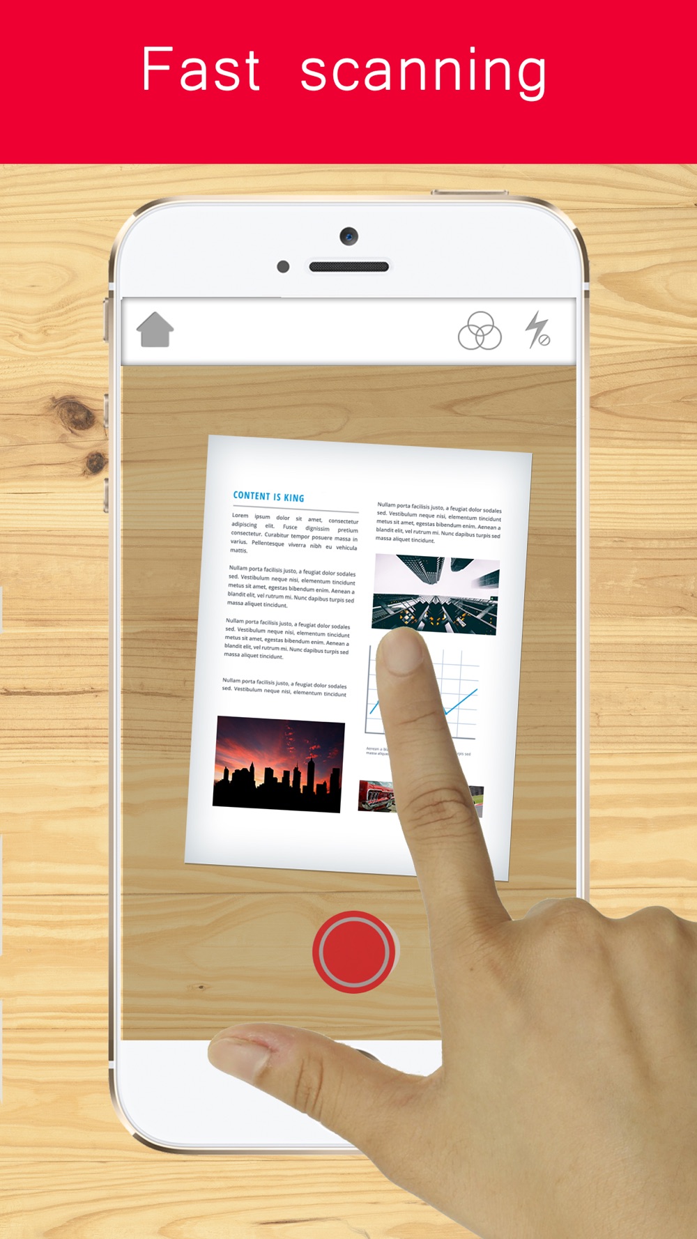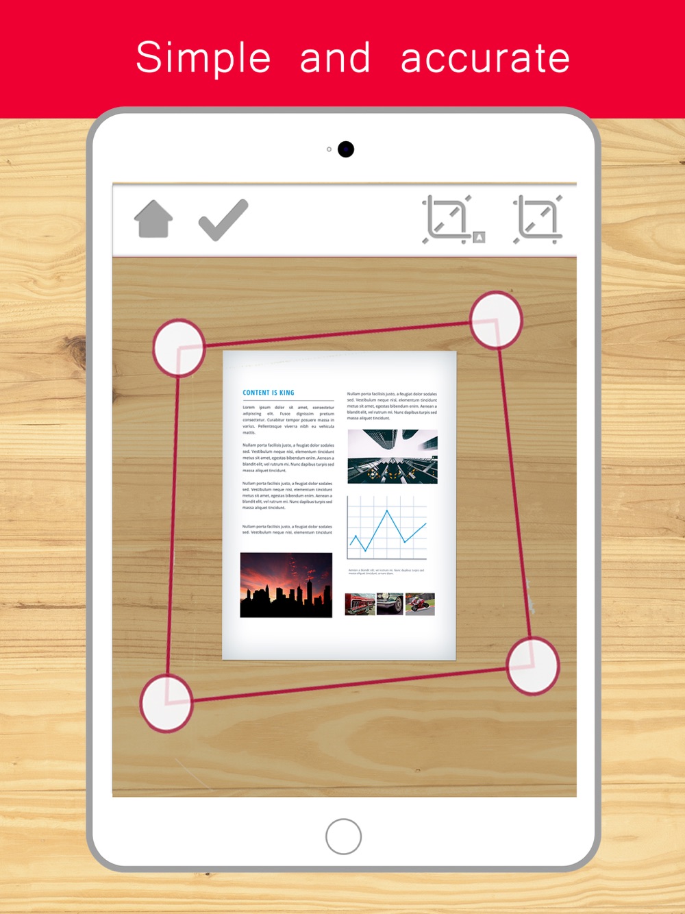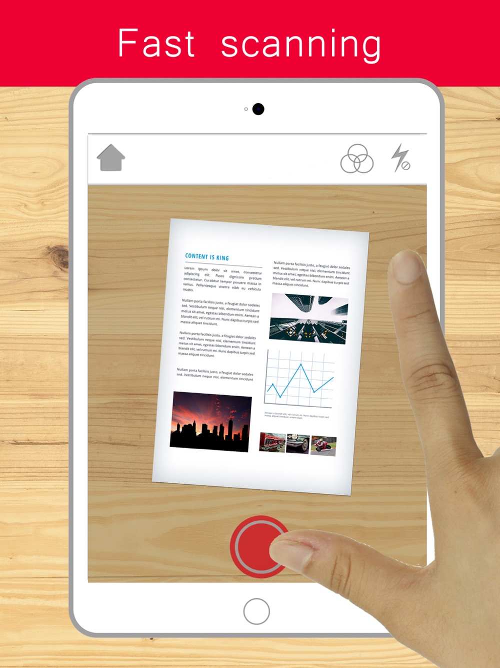 " 有了这个程序,你的设备变成一个口袋扫描仪。您的相片,实况发言:,收据,连黑板,将快速,轻松地数字化。可以在拍摄照片的网站或挑选一个从您的画廊之间进行选择。