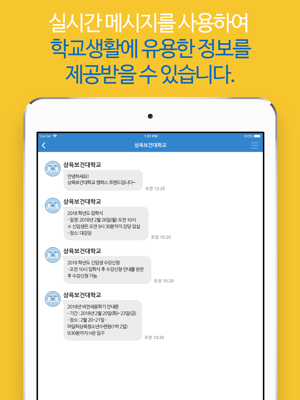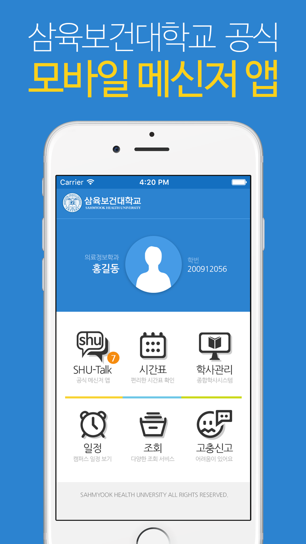 커뮤니케이션 기능이 강화된 삼육보건대학교 SHU-Talk을 설치하시면 학교생활에 유용한 정보를 제공받을 수 있습니다.