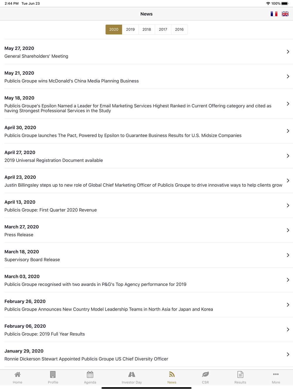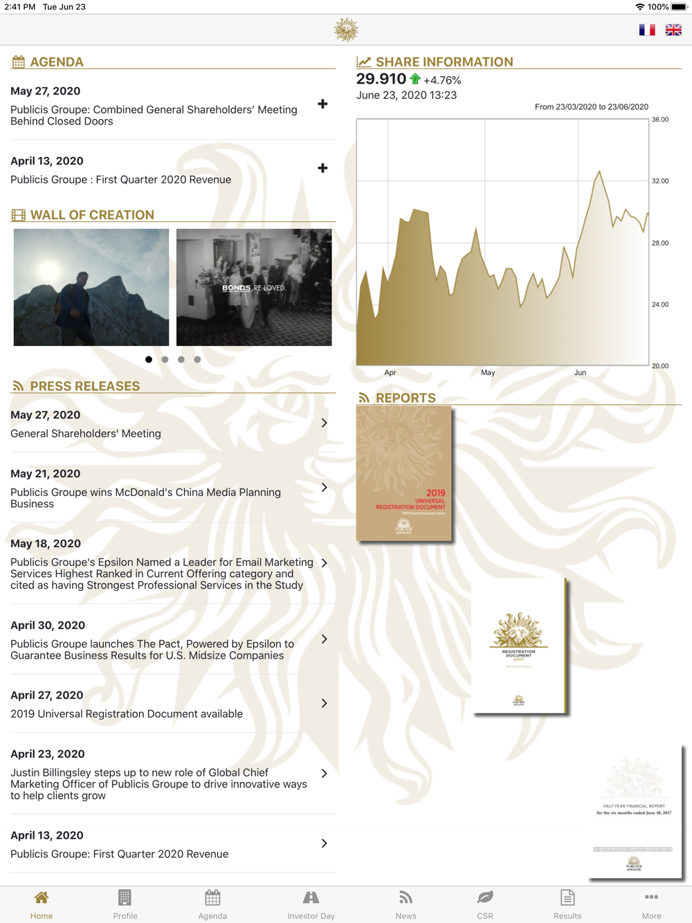 The Publicis Investor Relations app allows investors, analysts and media to remain up to date with financial and corporate information on Publicis Groupe: Group’s creations, company profile and key figures, events calendar, press releases, financial results and webcasts, real time share price information, financial reports and Annual General Meeting.