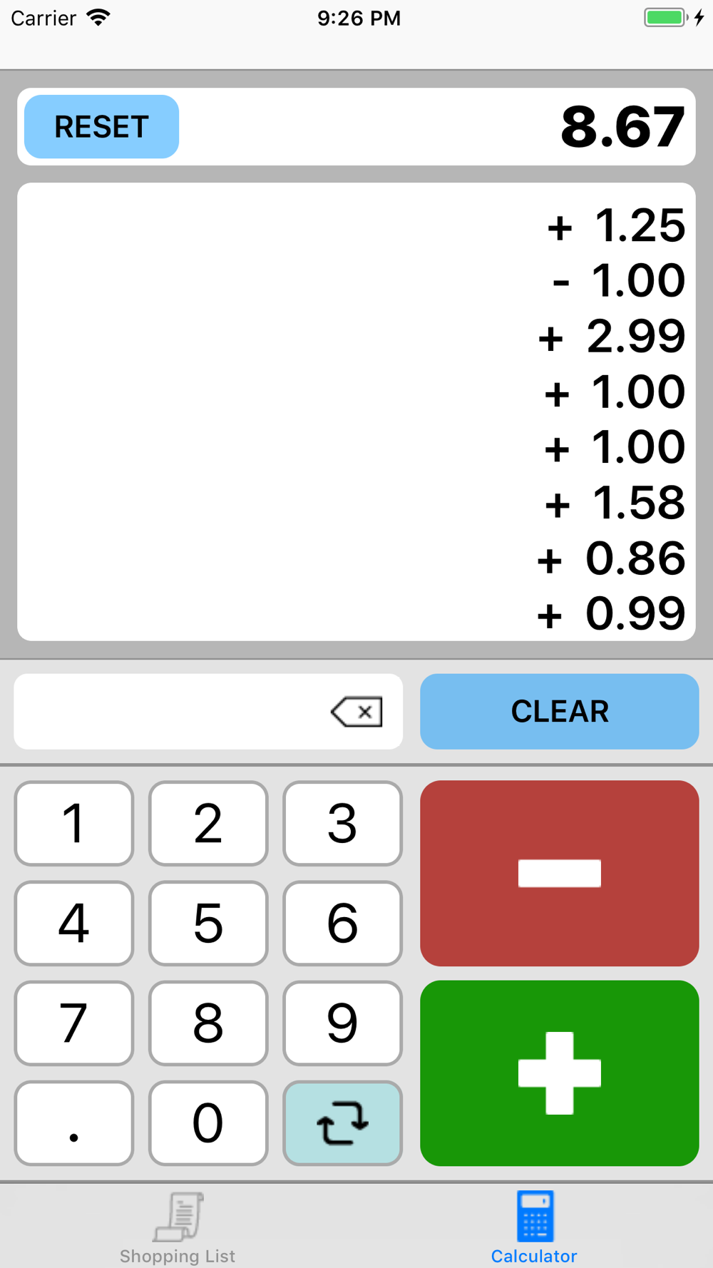 Shopping helper is a simple to use app with two sections. This first is your shopping list, you can add your list of items to the list before leaving the house and mark them as added to your basket as you put them in making sure you never forget anything. The second section is a calculator that make it easy for you to keep a running total of how much your shopping is going to cost. The calculator has a simple design with an add and remove button and keeps a running list of the items you have added (the cost).
