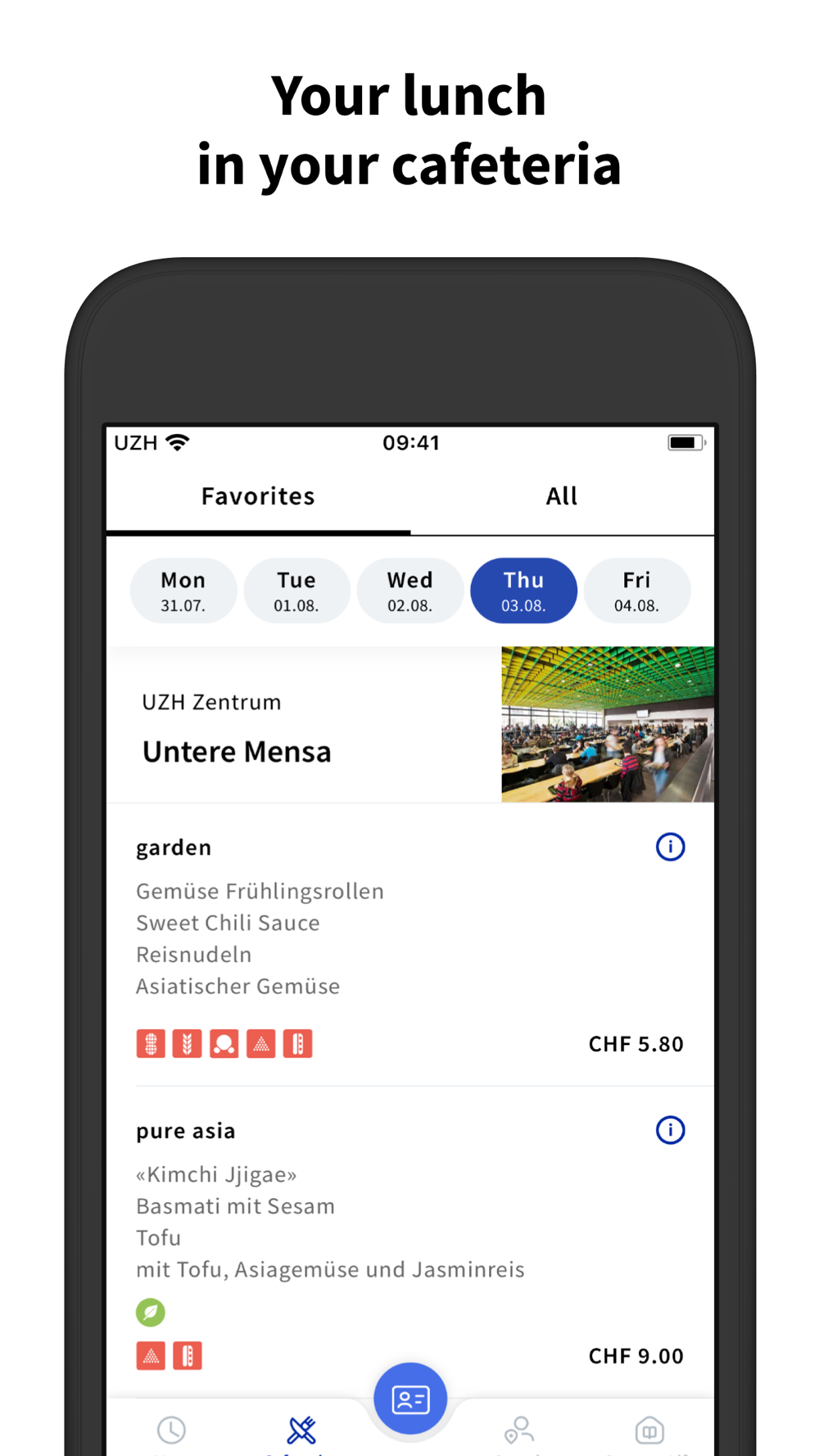 Cafeteria: Choose your favorite cafeteria or check the menus at UZH and ETH cafeterias near you.