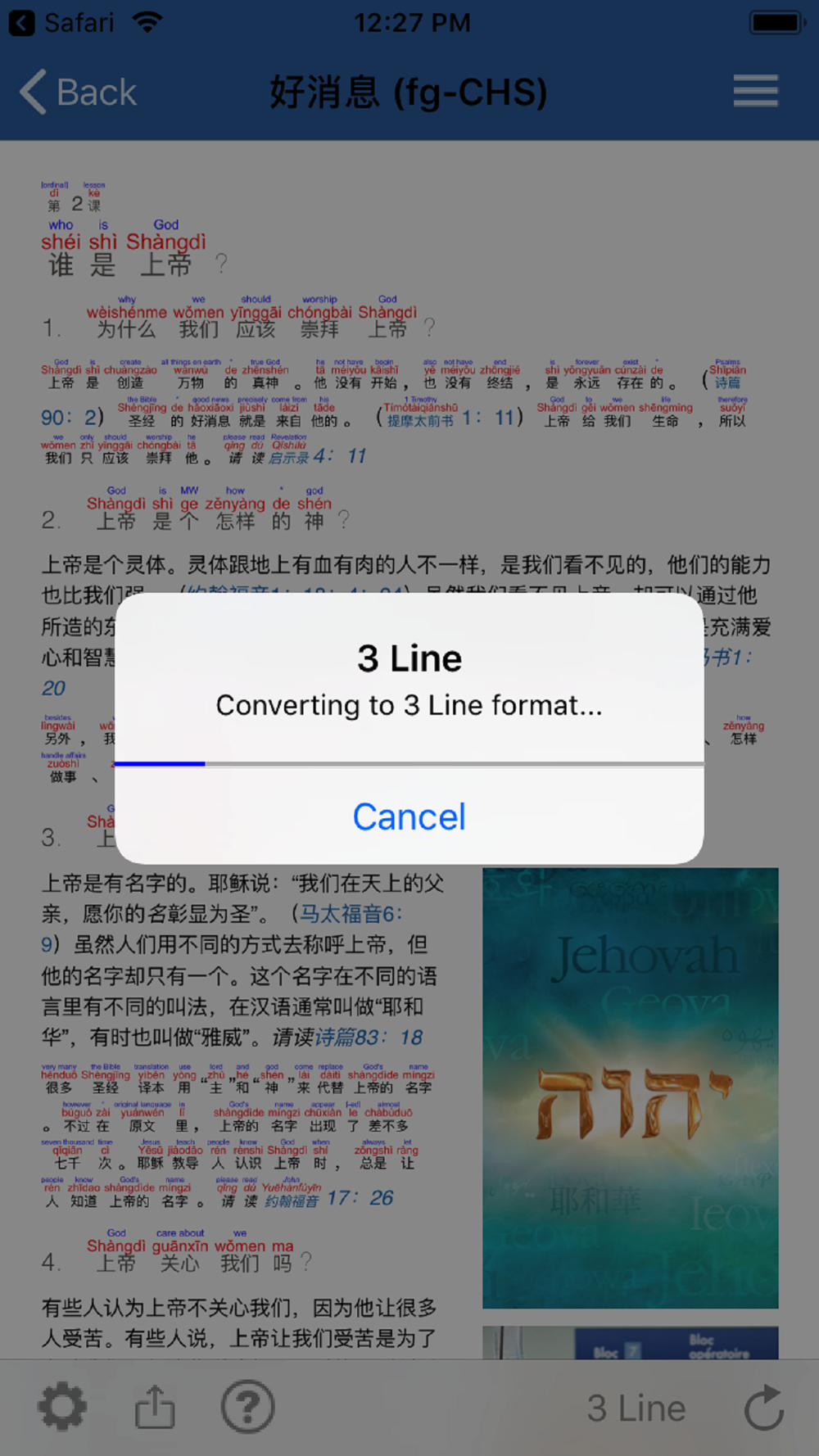 Import ePub files that are in Simplified or Traditional Chinese and then have them converted to add a romanization line (pinyin, Sidney Lau, Yale), and a native language line (English, Spanish). The document can then be converted to PDF. It is also possible to copy Chinese text and paste it into the app. In addition, you can copy a URL from the Safari web browser, and paste in the URL to pull up the entire web page in the app and then convert it to 3 lines.