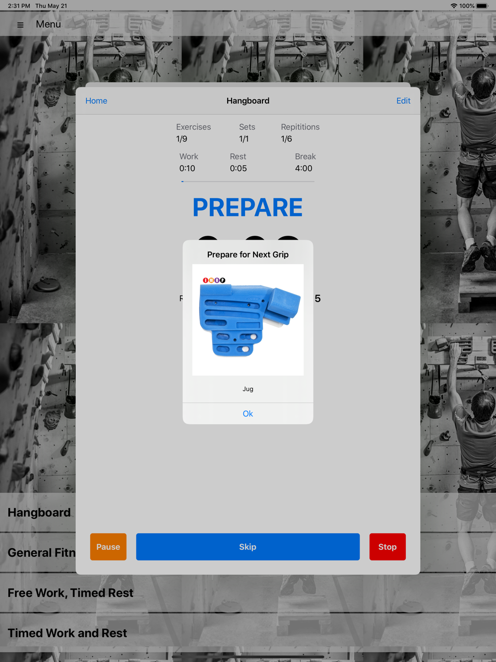 This app by Trango Climbing provides workout timers based on the Rock Climber's Training Manual protocol and the Rock Prodigy series of hangboards: