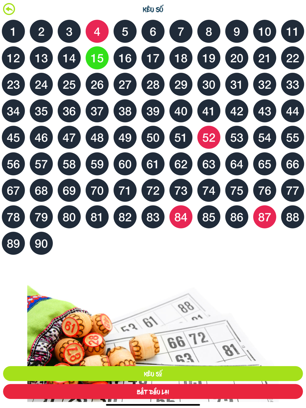 - Làm cái: Máy tự động rao lô tô theo chuỗi số ngẫu nhiên, khi nhấn nút "Kêu Số".
