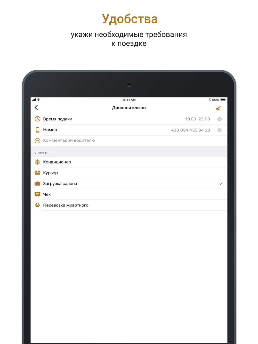 - выбор дополнительных услуг по заказу - возможность указать необходимые для поездки условия, например, перевозка животного