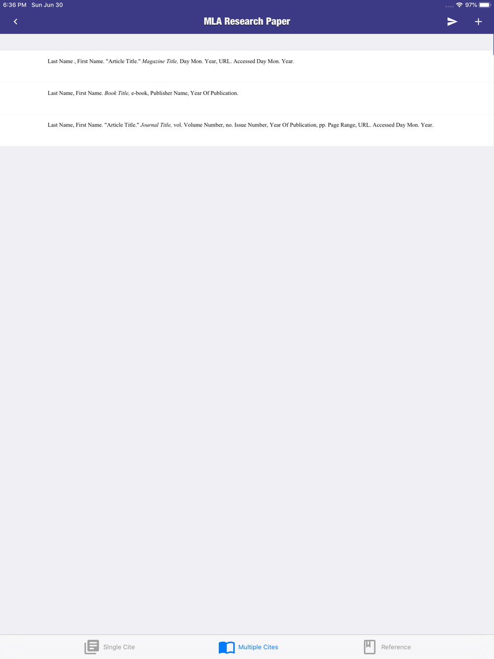Cited is the easiest citation creation app. Simply select your paper format and your template, enter the information, and press create. Now with a section to create and save multiple citations.