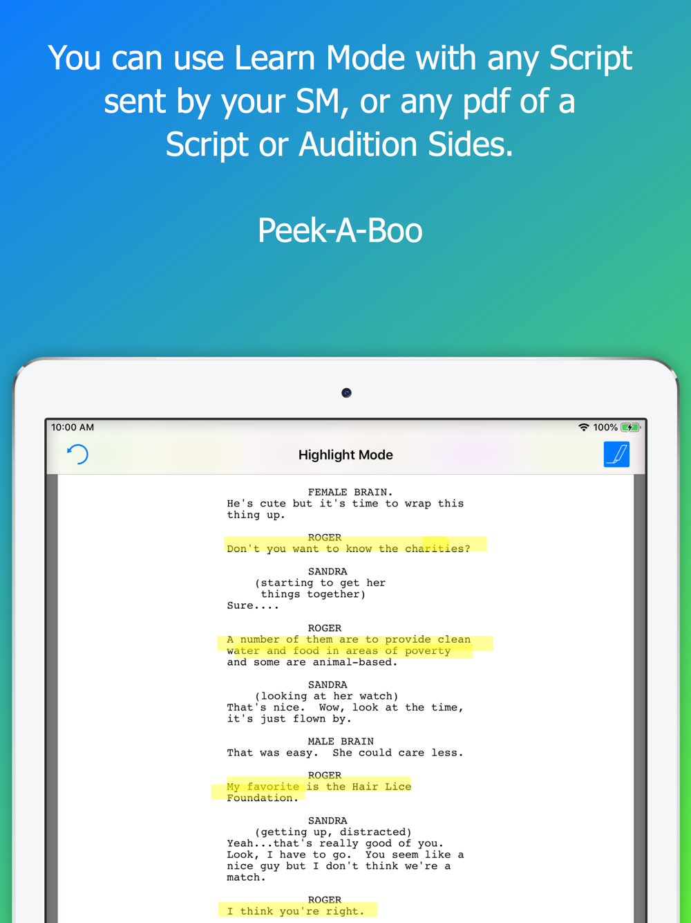 Get Off-Book: As an added bonus, the Line Notes for Actors & Crew app let's you Swipe to Highlight all your lines then use the Blackout Feature to get Off-Book even faster. Ever cover up your lines with your hand and play Peek-A-Boo to see if you know them? It's kind of like that but way better.