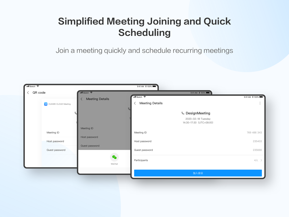Invite participants using the address book, a QR code, WeChat, an SMS message, or by email.