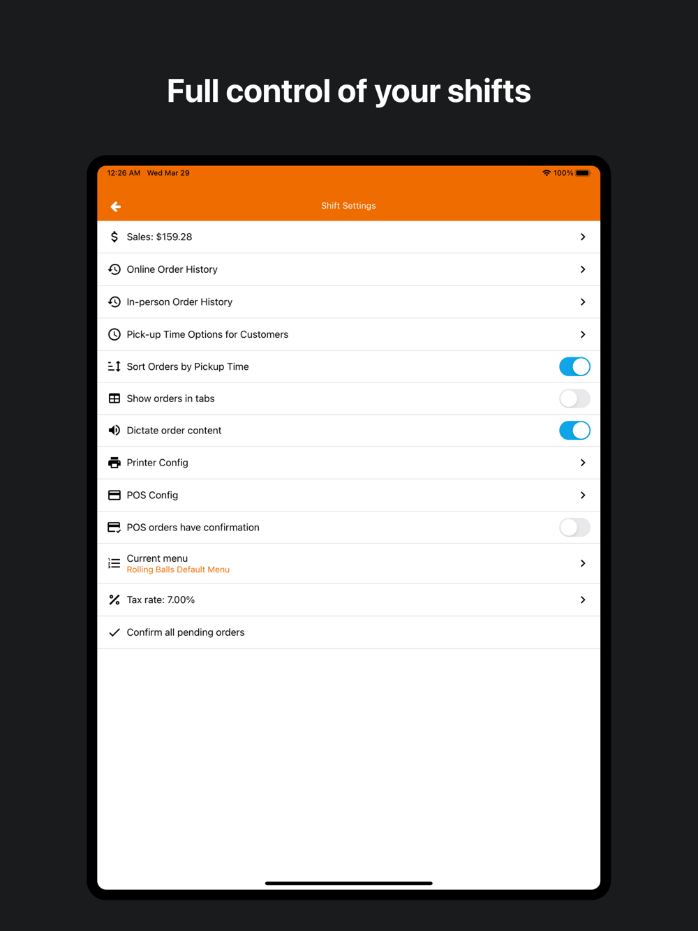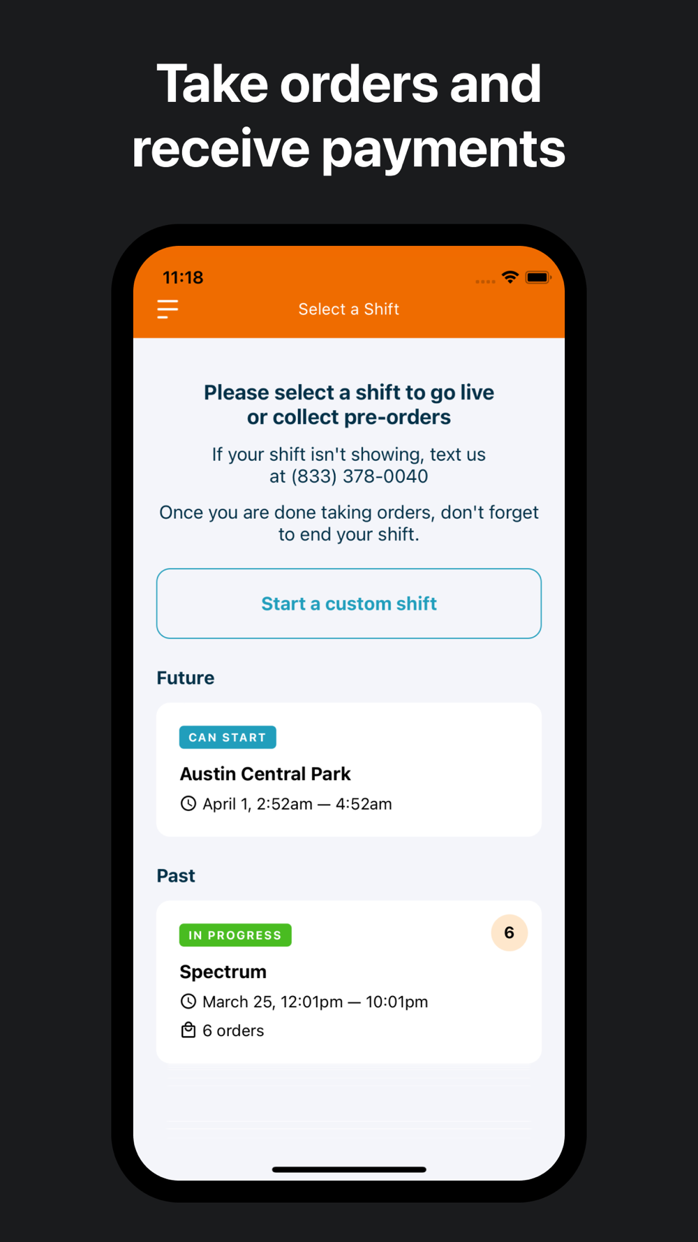 Take orders and receive payment through your phone or tablet. Reach customers at their office, a bar, or event with your menu, and make it easy for them to order and pay. Just confirm the order and when the food is ready, and the customer will be notified by text. Simple. Convenient. Easy.