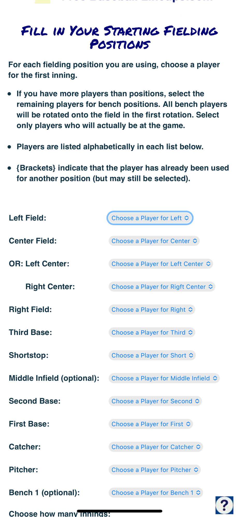You can build lineups for up to 11 fielding positions, or for coach-pitch or coach-catch. Plus up to 6 bench positions, which rotate in after the first inning. And you can lock out individual players from playing first base, catcher, or pitcher, for safety. Give it a try!